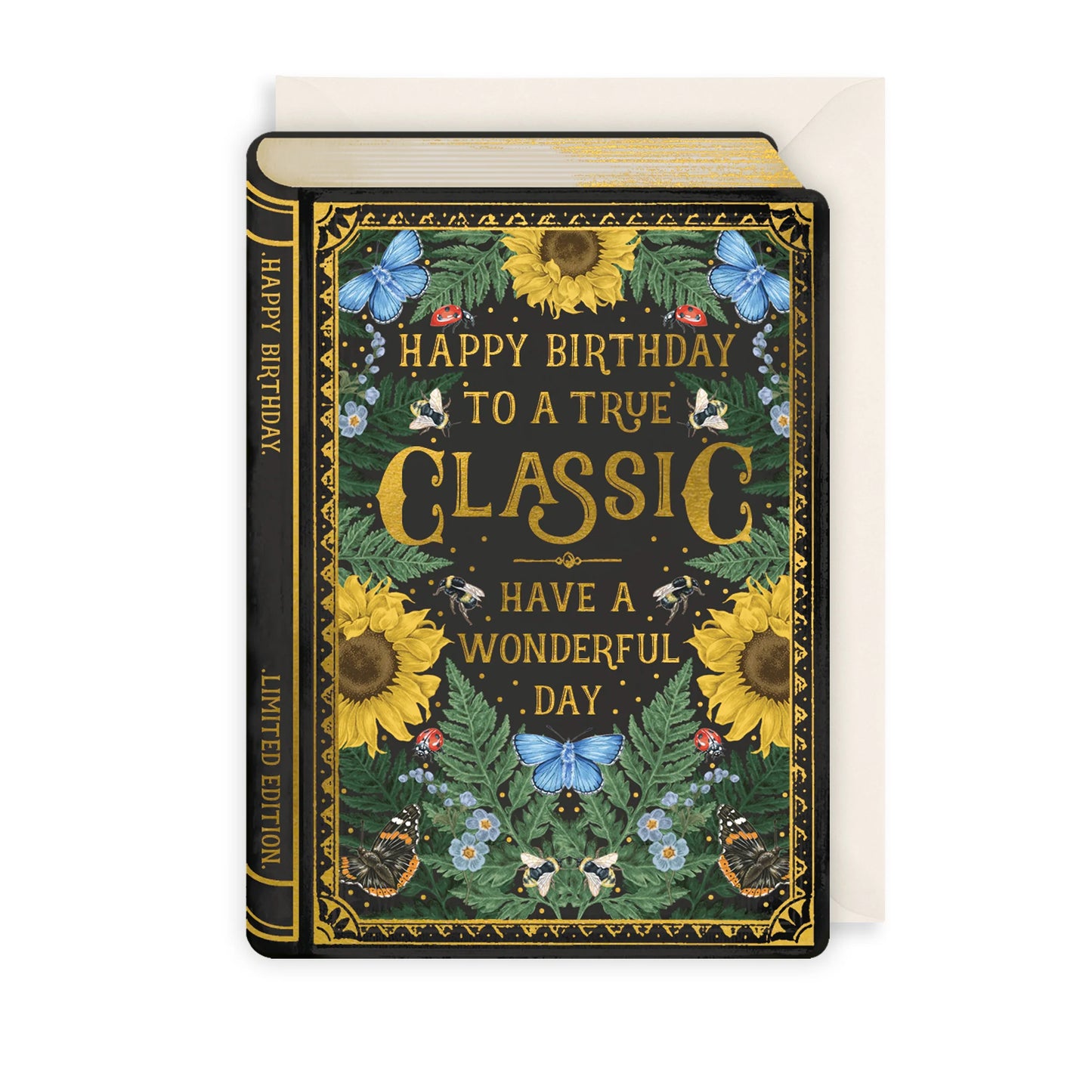 Treat a book lover on their birthday with this fantastical card. This card is shaped like a book and features magical botanicals on the front. The card reads 'Happy birthday to a true classic, have a wonderful day!'.