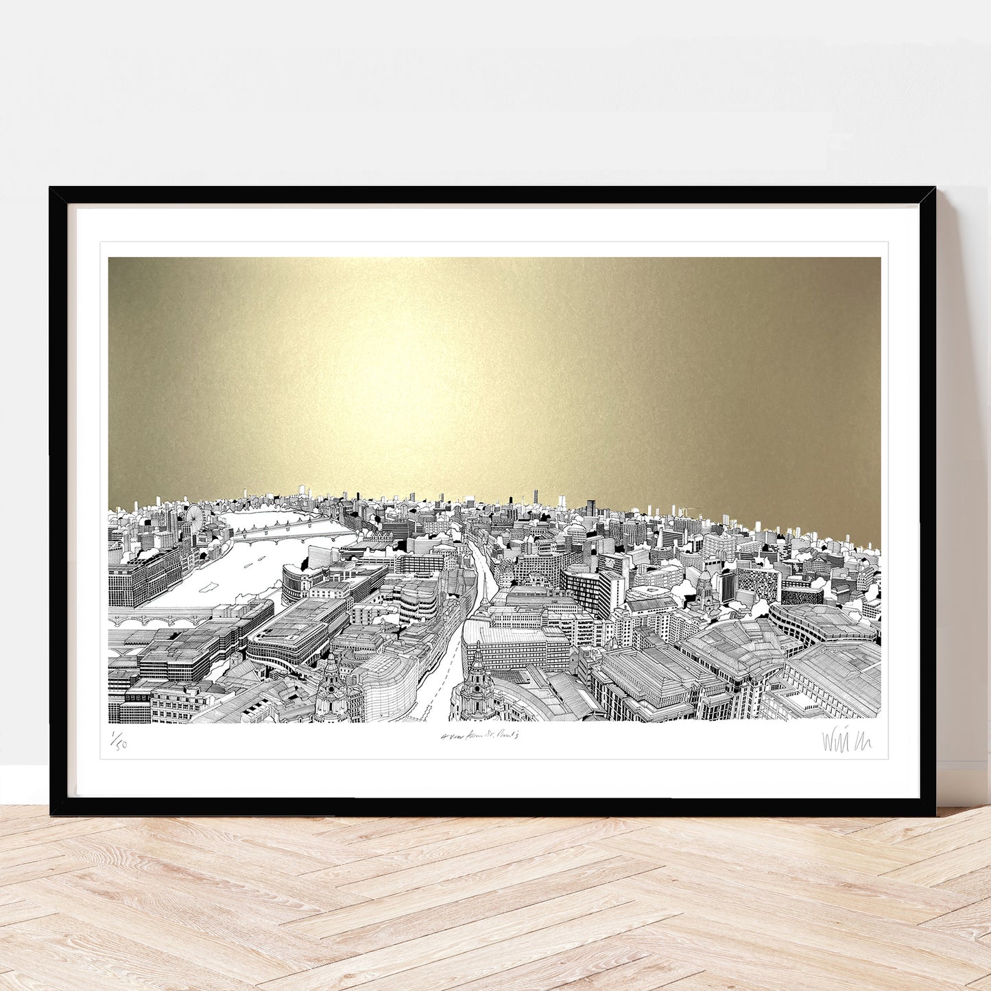 Detailed architectural illustration from the dome of St Paul's Cathedral looking towards Ludgate Hill and the Strand by Will Clarke. This illustration took over 5 months to complete and captures the old winding streets of London as well as the river Thames and Waterloo bridge.