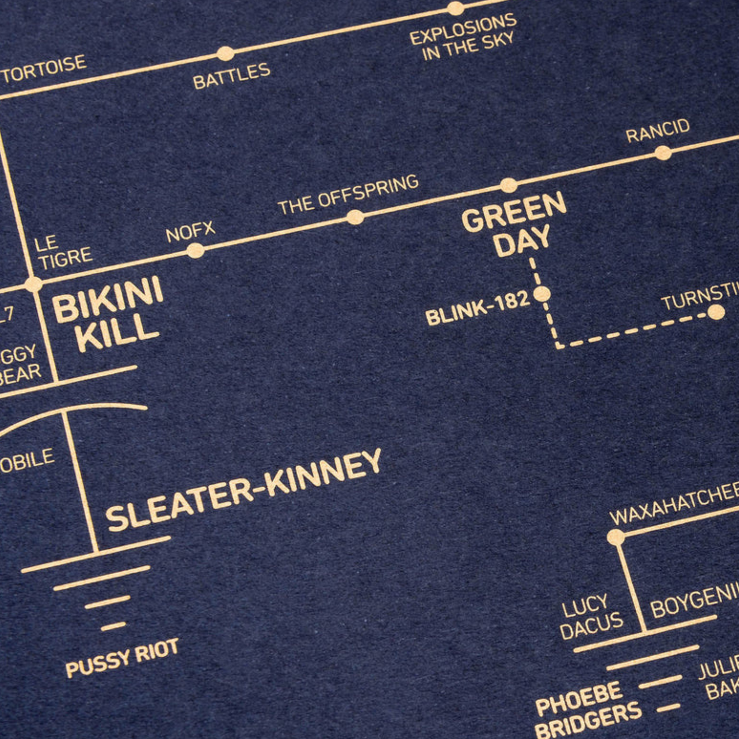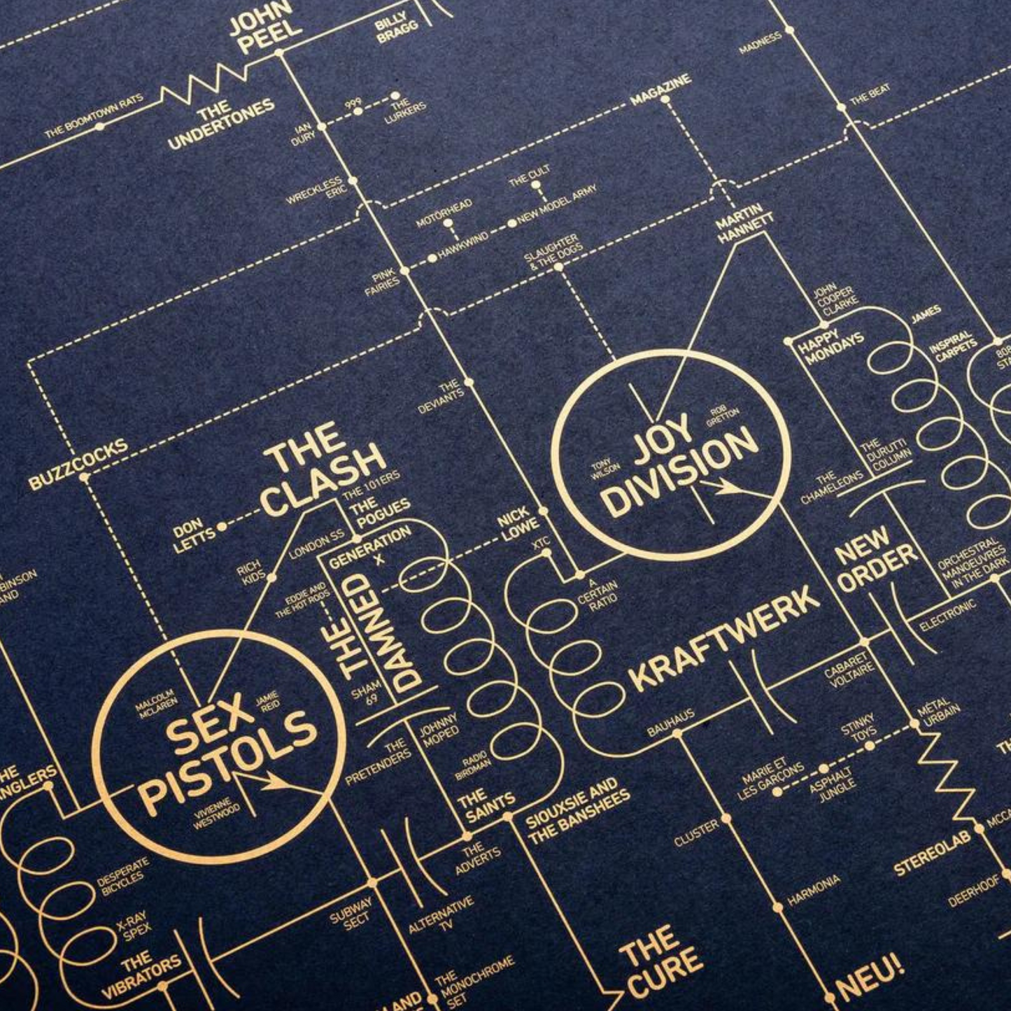 A history of alternative and independent music print by We Are Dorothy, mapped out to the circuit board of an early transistor radio.