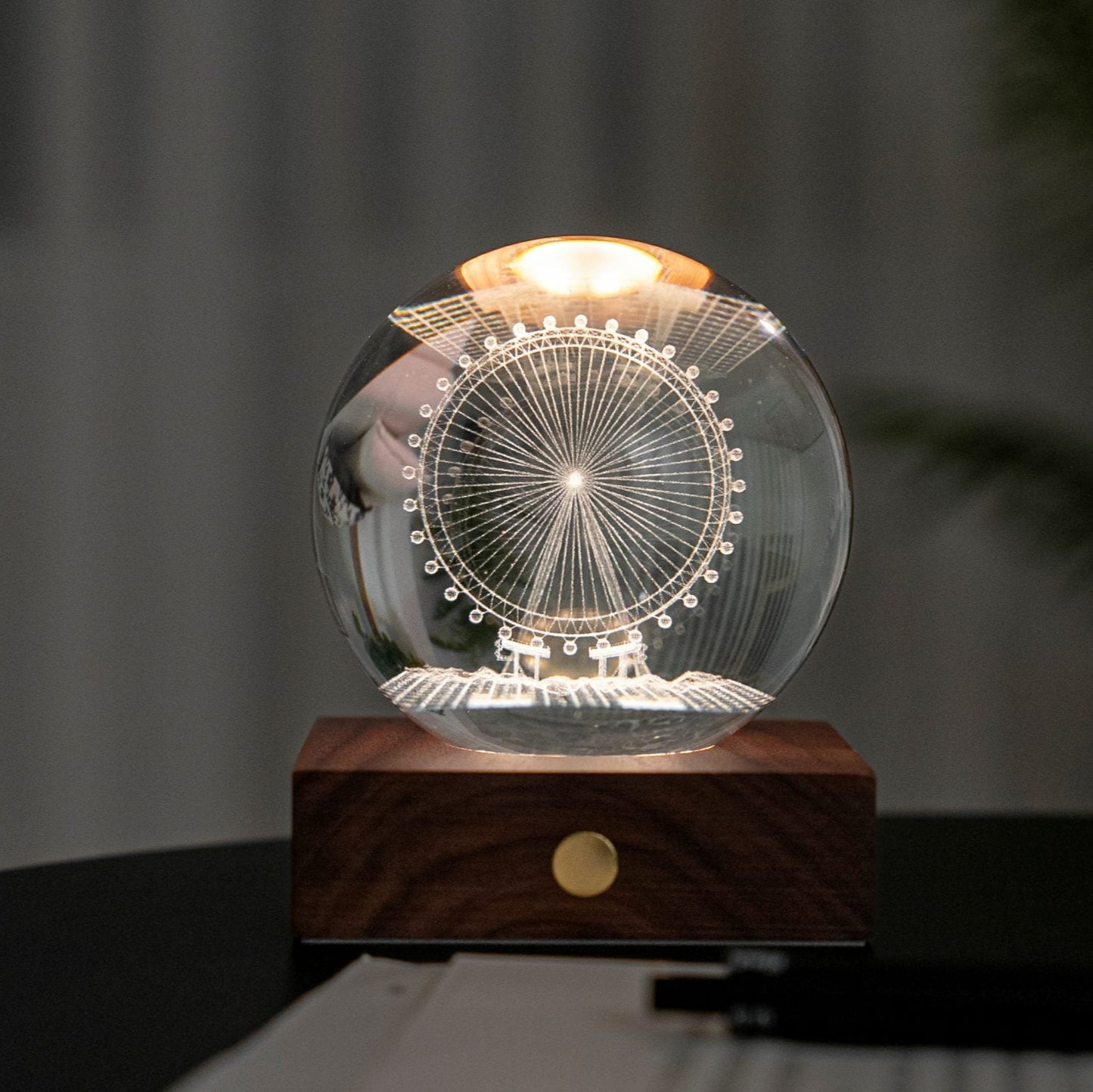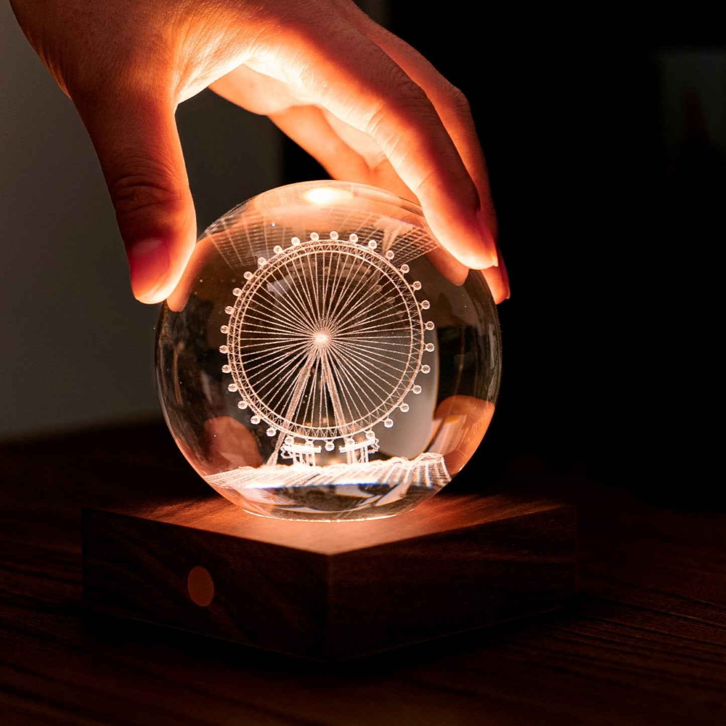 This Ferris Wheel motif brings the magic and nostalgia of a fairground into your home. The stunning design captures the elegance and grandeur of a Ferris wheel. No matter which design you choose, the Amber crystal ball will reflect light in a way that creates an enchanting atmosphere. You can switch between three light intensity levels by touching the copper button on the front of solid natural walnut wood base.
