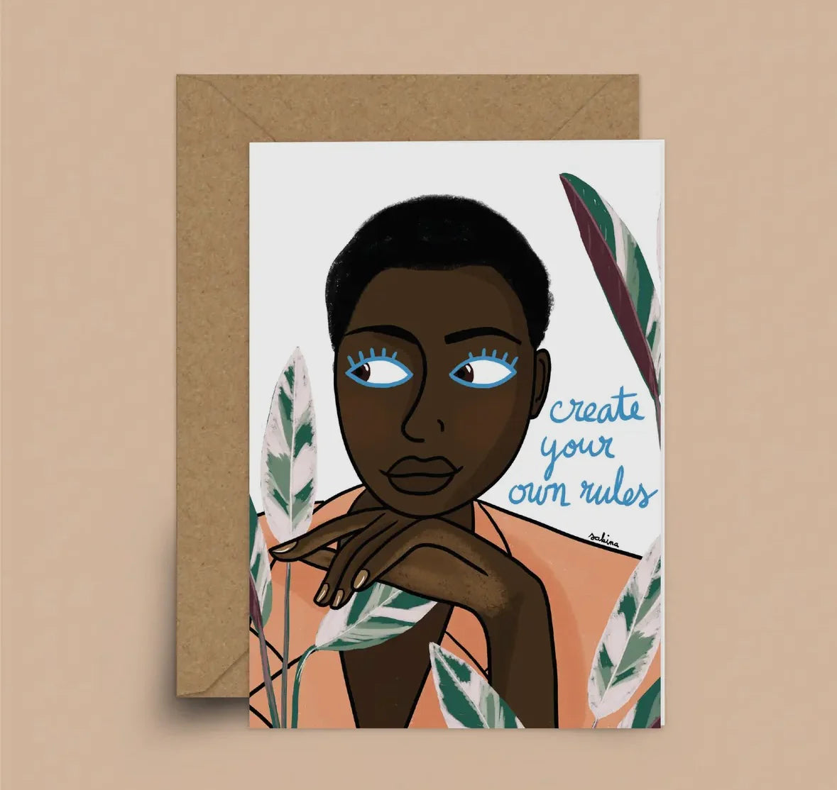 Greeting card by Heyimsakina printed in the UK on FSC certified 300gsm warm white recycled board.