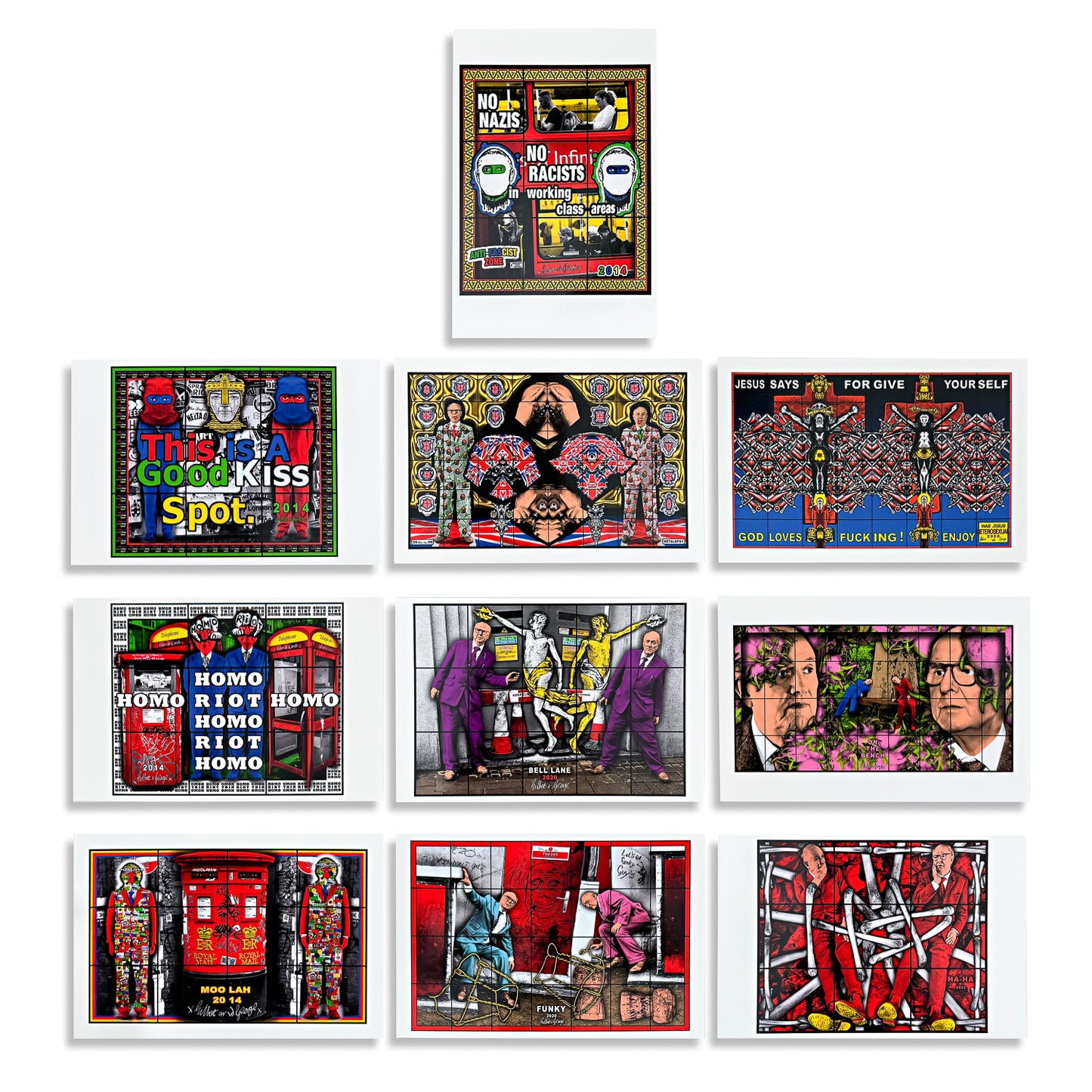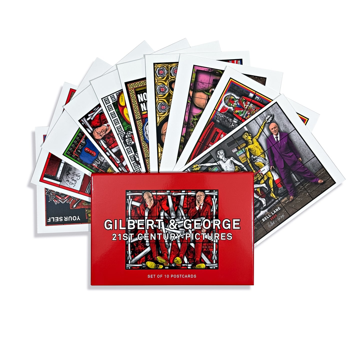This set includes 10 postcards showcasing a selection of Gilbert & George’s art from the 21ST CENTURY PICTURES exhibition at the Hayward Gallery.