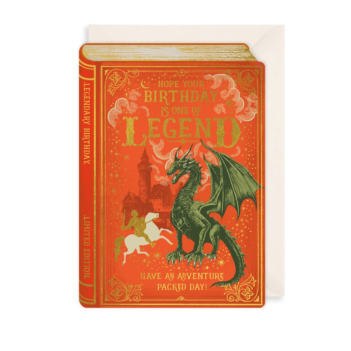 Treat a book lover on their birthday with this fantasy adventure themed birthday card. This card is shaped like a book and features a knight bravely battling a dragon. The card reads 'Hope your birthday is one of legend, have an adventure packed day!'.