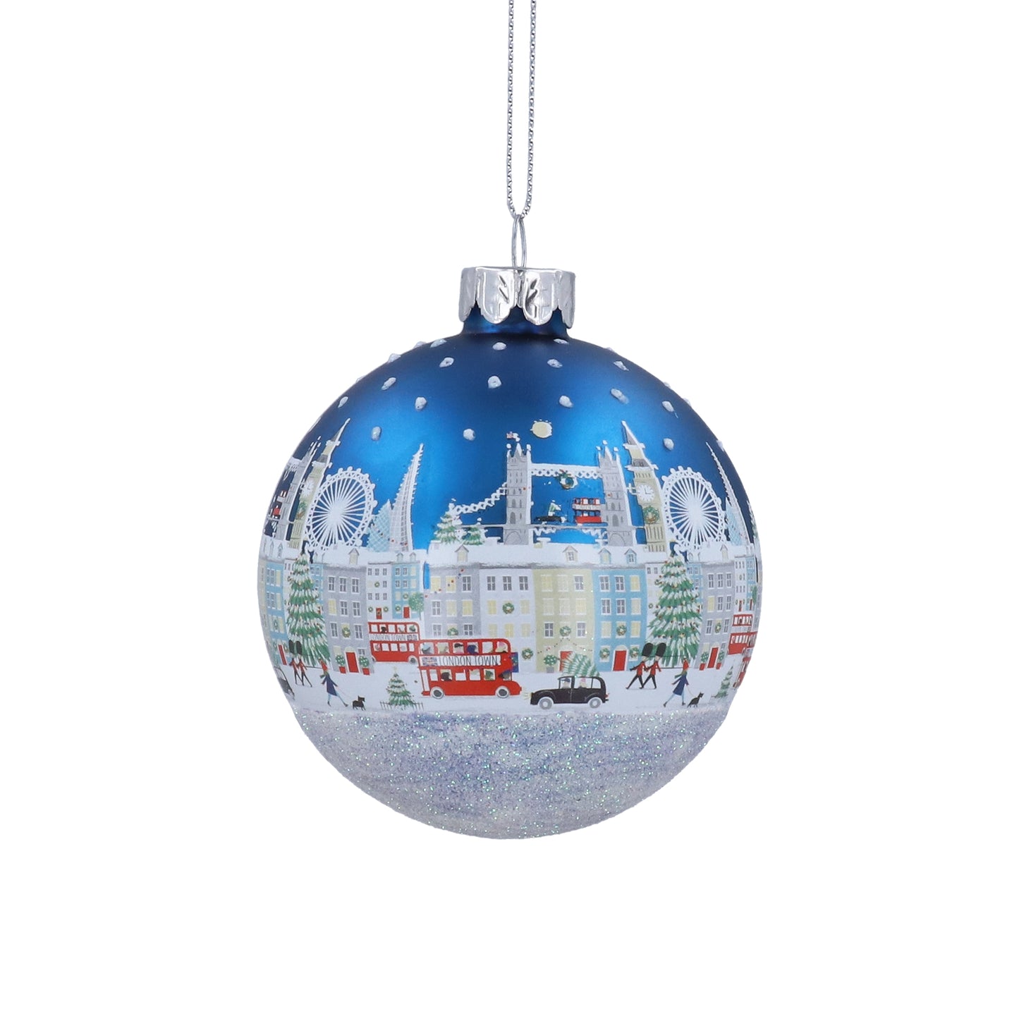 Made from blue glass, it features iconic London locations such as The London Eye, Big Ben, The Gherkin and The Houses of Parliament, all painted in white shimmering accents.