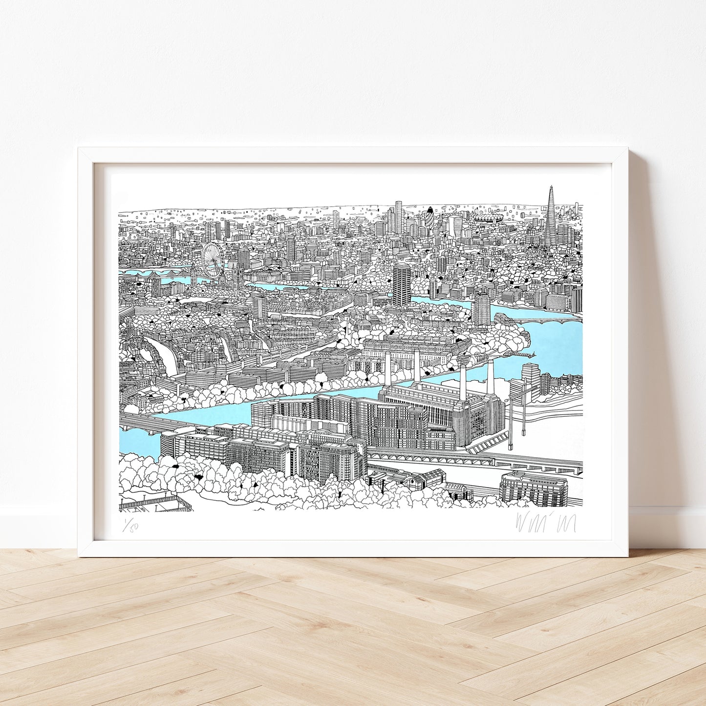 This illustration took a number of months to complete and looks from the south of the River Thames over Battersea and out across London. The print features landmarks such as Battersea Power Station, Chelsea Bridge, Westminster Abbey, the Houses of Parliament, the London Eye, the City of London and the Shard.