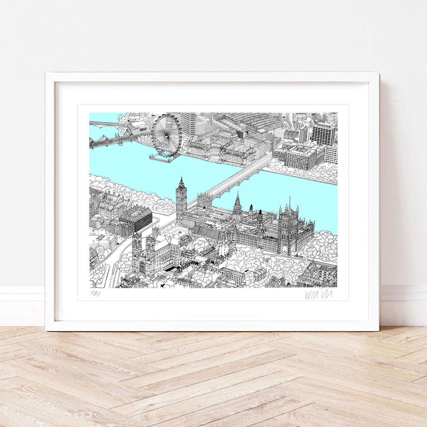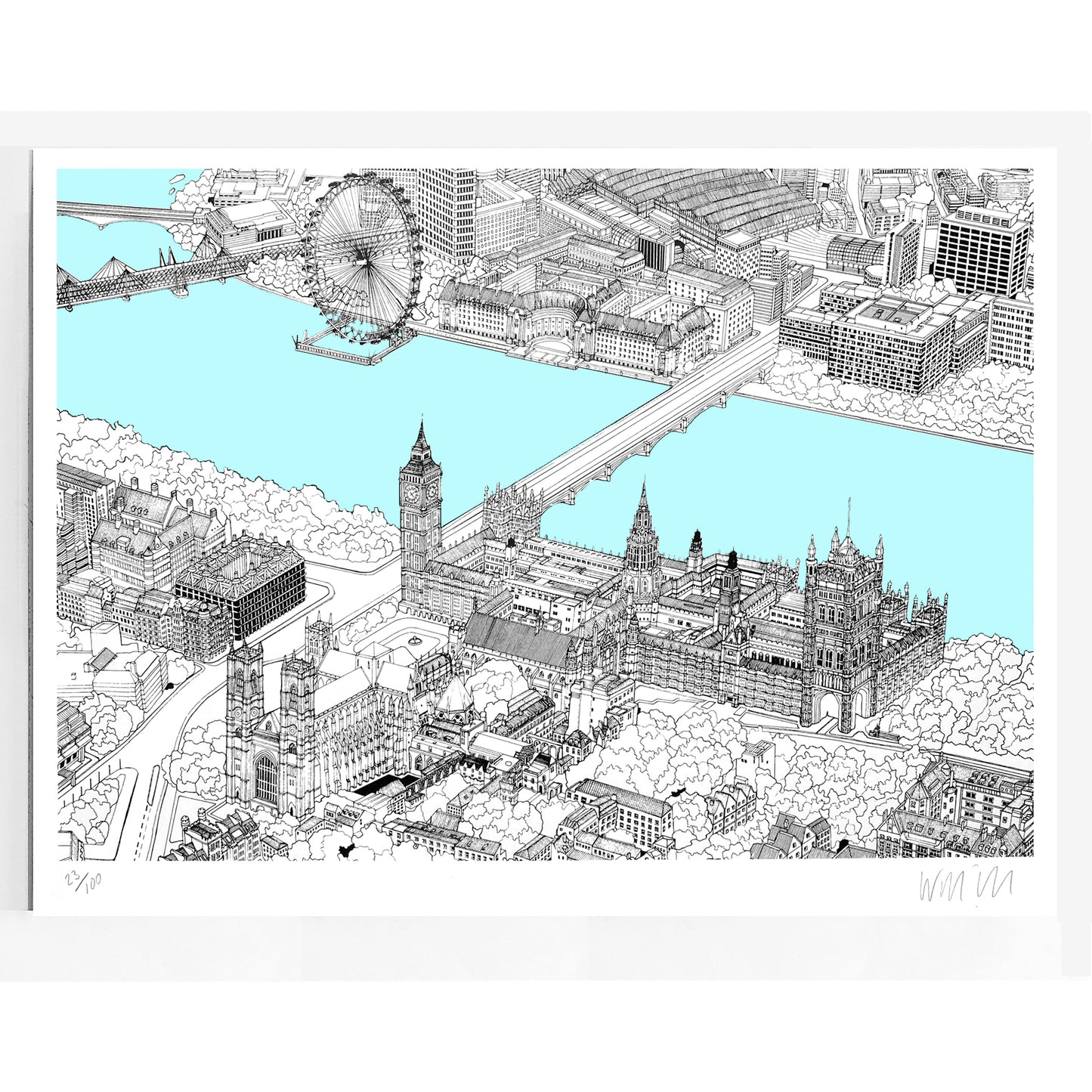 This limited edition handmade silk screen print features the Houses of Parliament and a striking blue River Thames. The original drawing took six months to complete and looks out across London from the Westminster area of the city. The image features some of London's most iconic landmarks such as the London Eye and Waterloo Station.