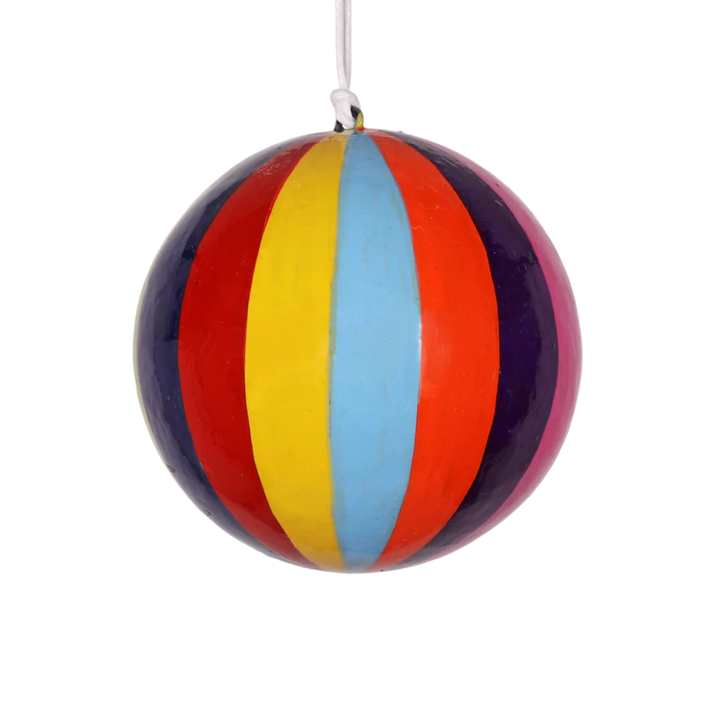 Handmade in Kashmir using traditional techniques, each bauble is crafted from recycled materials and individually hand-painted with striking designs. Finished with a matching hanging cord, and measuring approximately 7cm in diameter, no two are exactly alike.