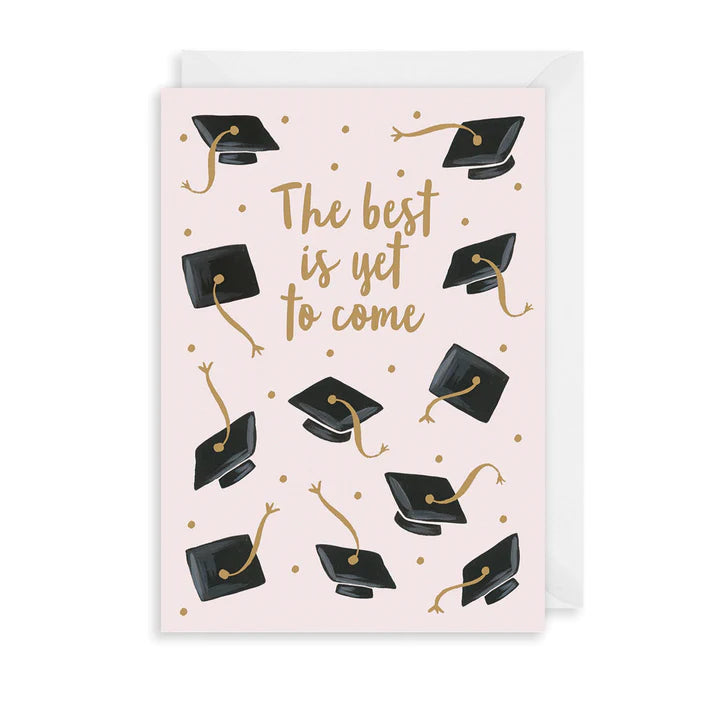 Say congratulations to a graduate with this emotive card. This card features a series of graduation caps and reads 'The best is yet to come'.