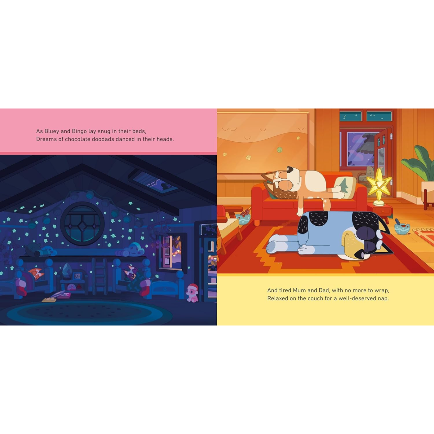 It’s Christmas Eve and Bluey and Bingo are tucked up snug in their beds. When suddenly a noise outside wakes them up . . . Who could it be?