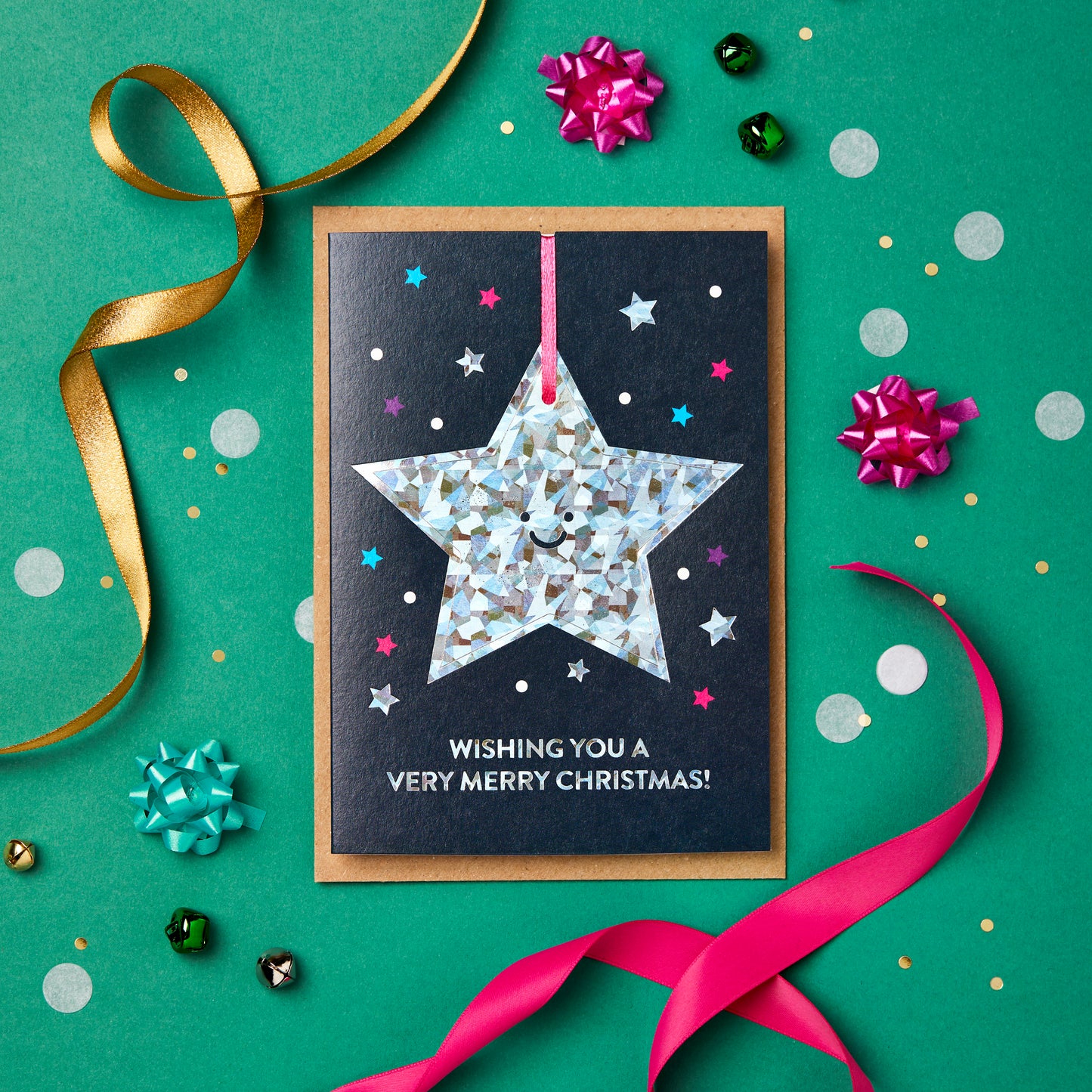 Christmas bauble greeting card finished with hot foil and a satin ribbon, the bauble can be popped out and hung on the tree to keep for years to come with your Christmas wishes on the back.