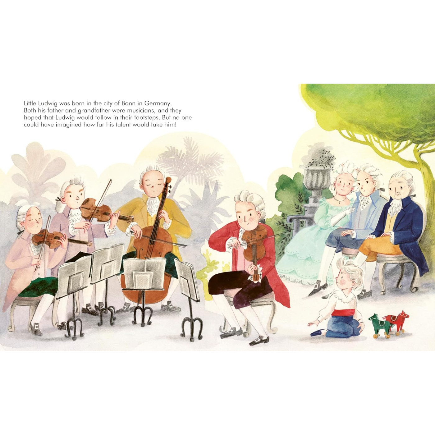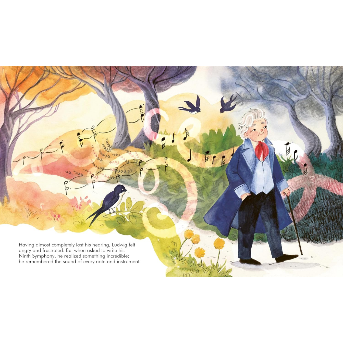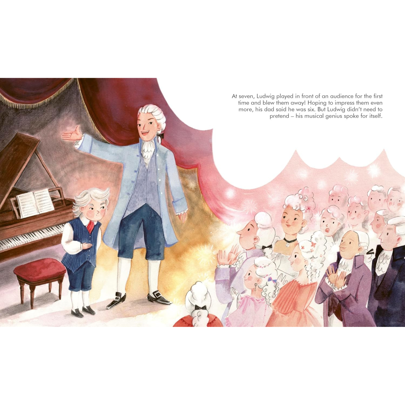 Little Ludwig grew up in the city of Bonn in Germany. His father and his grandfather were both musicians, and they hoped that Ludwig would take after them, but there's no way they could have known what Ludwig would one day achieve. He learned to play the piano before his feet could even touch the floor, and his talent only continued to grow with his hard work as he got older. He went on to compose amazing musical pieces, including symphonies for a whole orchestra, and his energy and originality blew his audiences away! But his musical skill was about to be put to the test . . . Ludwig began to lose his hearing, and eventually became deaf. He was really worried, as music was his life! But then he realised something amazing: he could still hear every instrument in his mind. Through resilience and creativity, Ludwig continued composing extraordinary pieces that changed musical history.