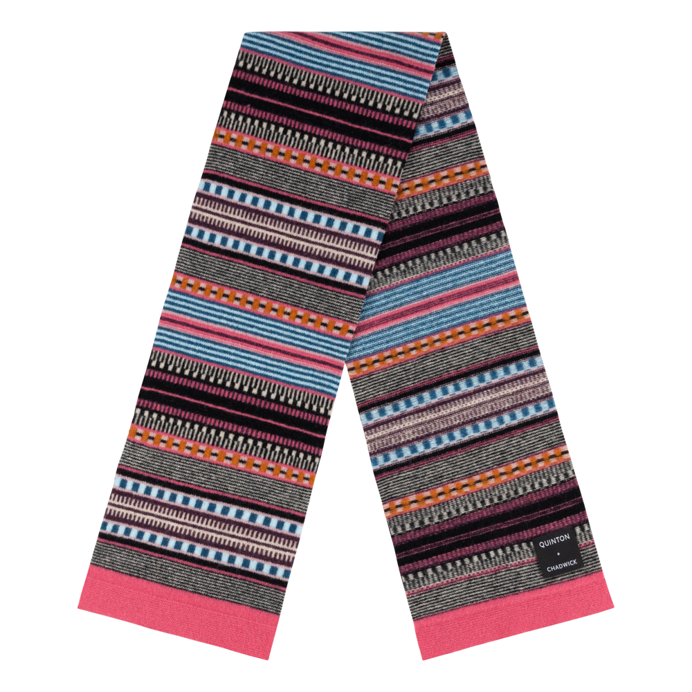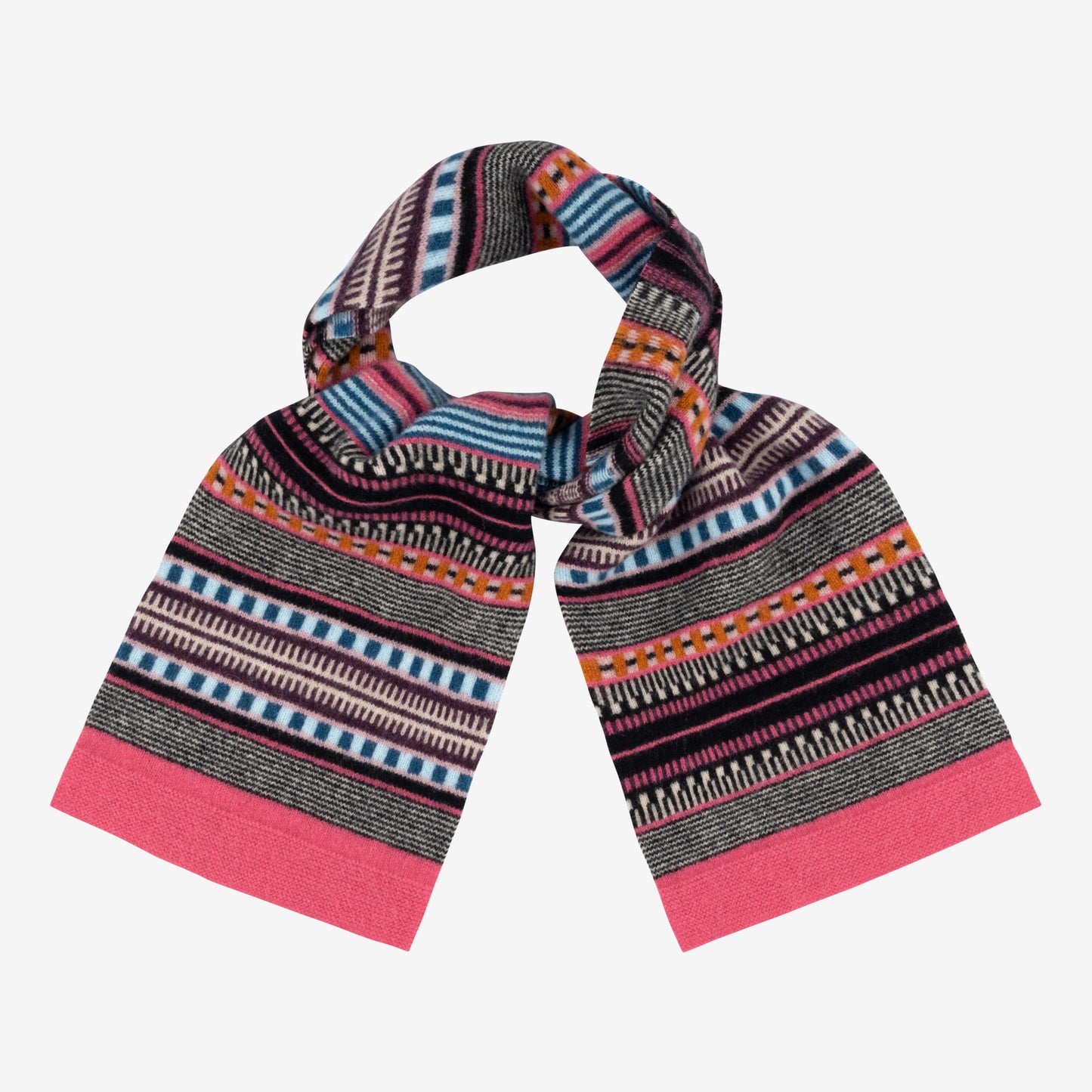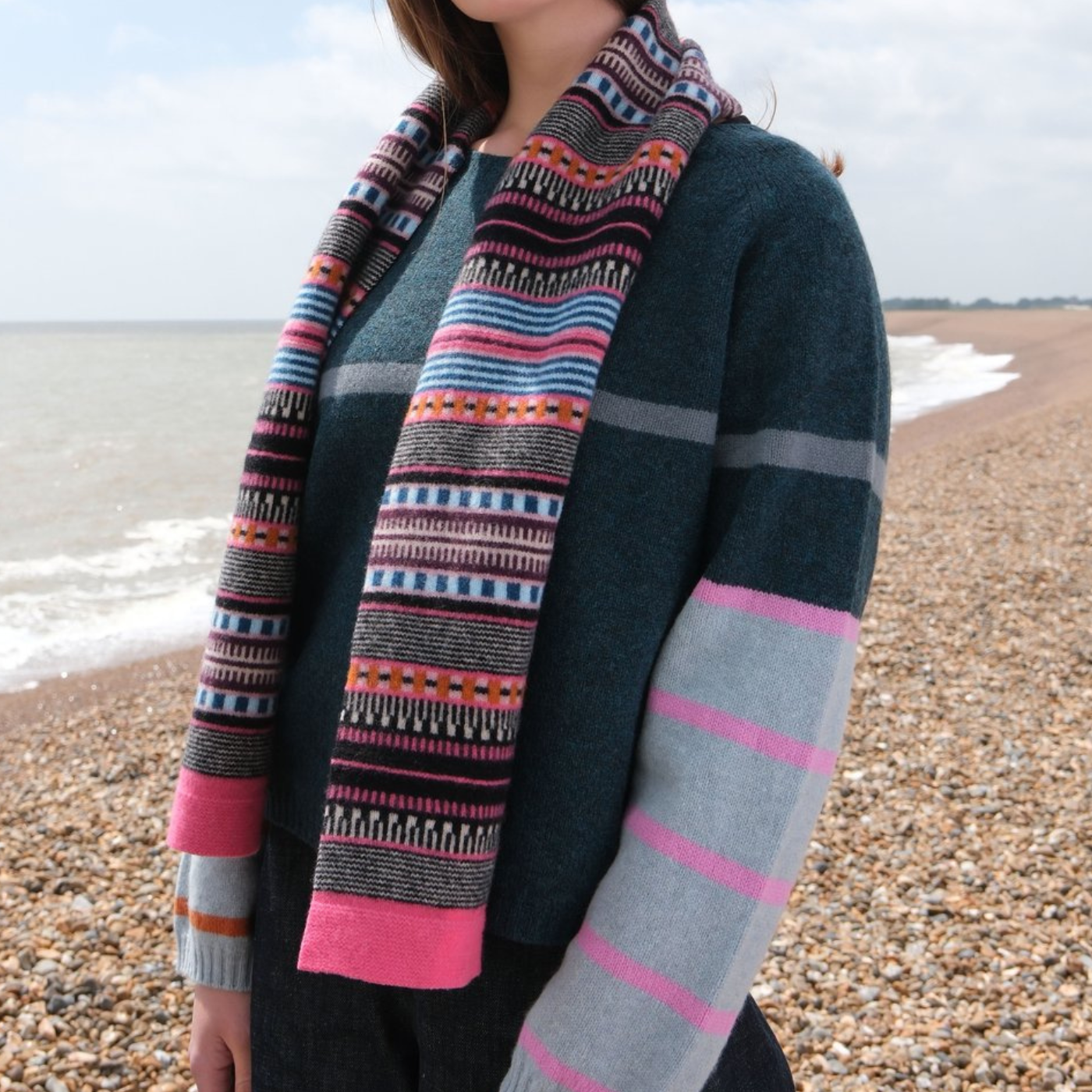 This small stripe scarf is the perfect size when you need a little warmth around the neck. It is an easy piece that’s the perfect size to wear inside as well as outside for a pop of colour.