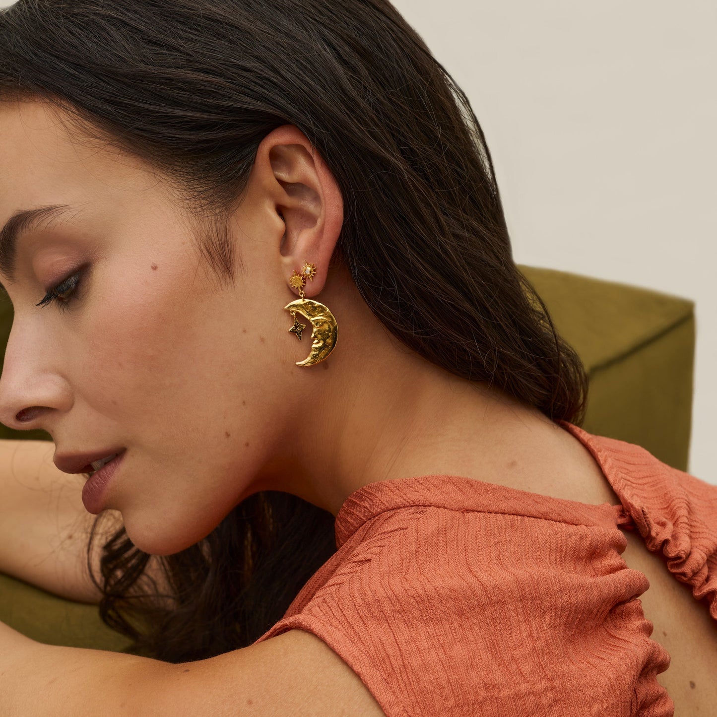 Crafted from 18ct gold-plated recycled brass, these drop earrings by Ottoman Hands feature statement crescent moon charms - a timeless symbol of intuition, femininity and new beginnings. Their gorgeous, detailed design makes them perfect for both day and night styling. Add them to your rotation for a touch of lunar magic with every wear.