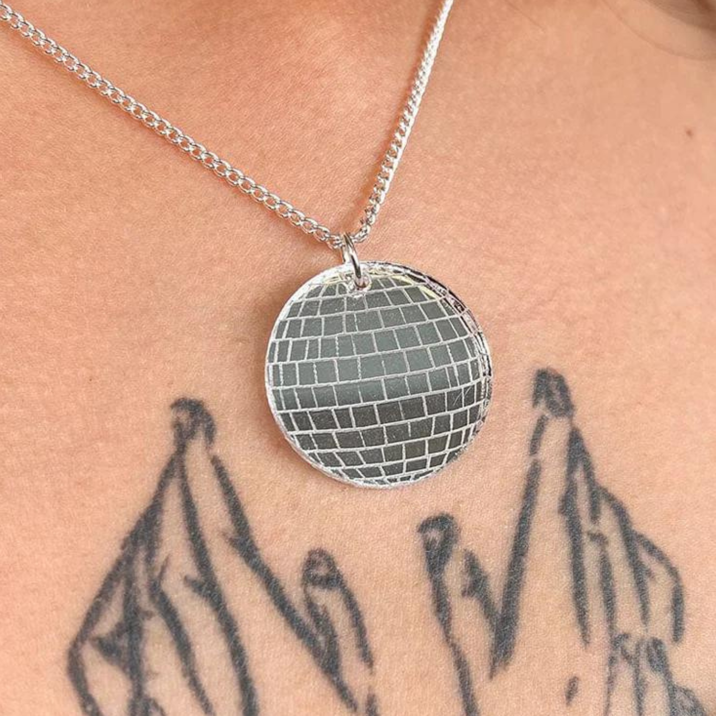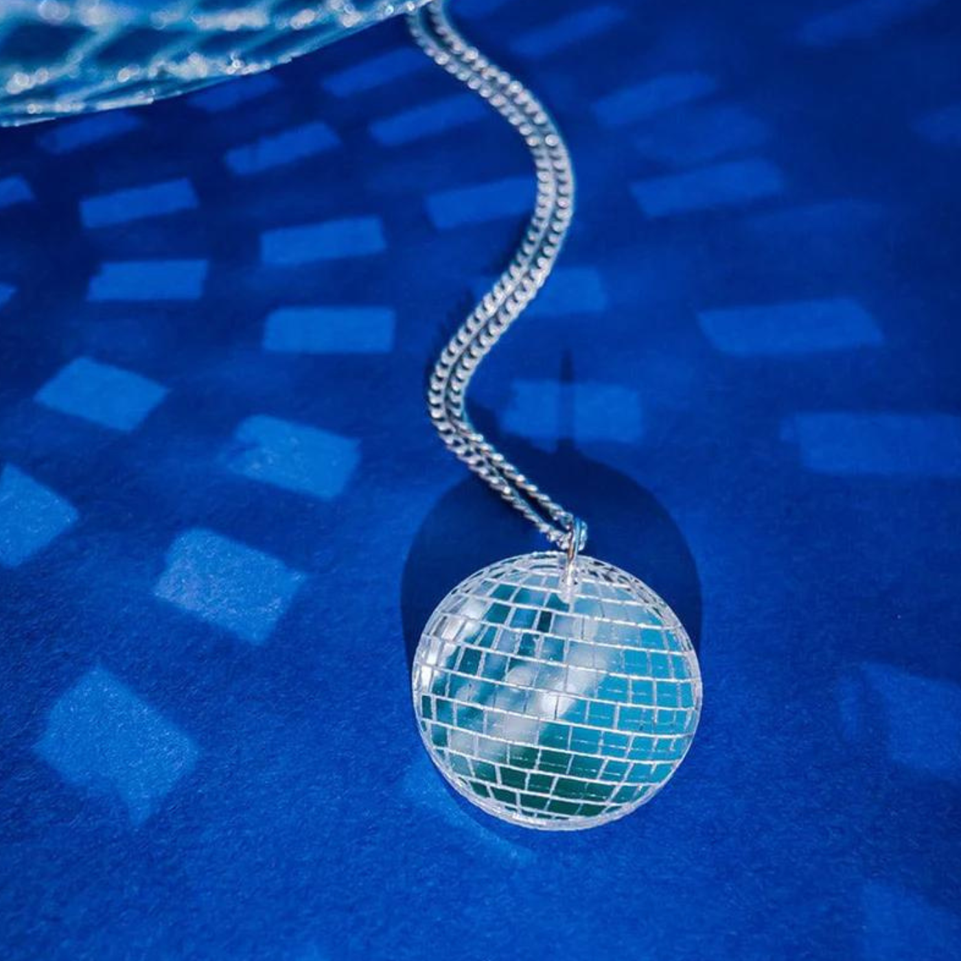 Swinging from an adjustable silver-plated chain, Tatty Devine recreated a pint-sized mirror ball in silver mirror acrylic. Creating an illusion: grid-like etched details make this 2D disk look just like the real thing!