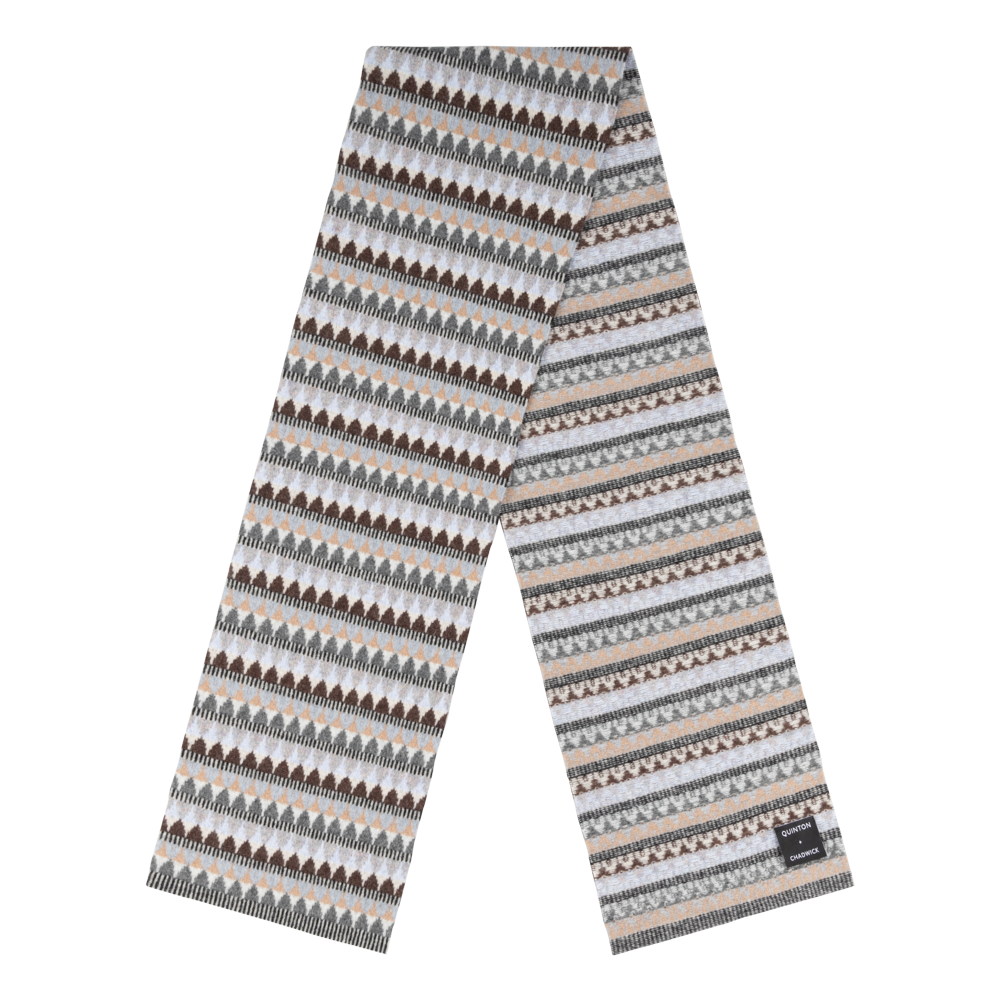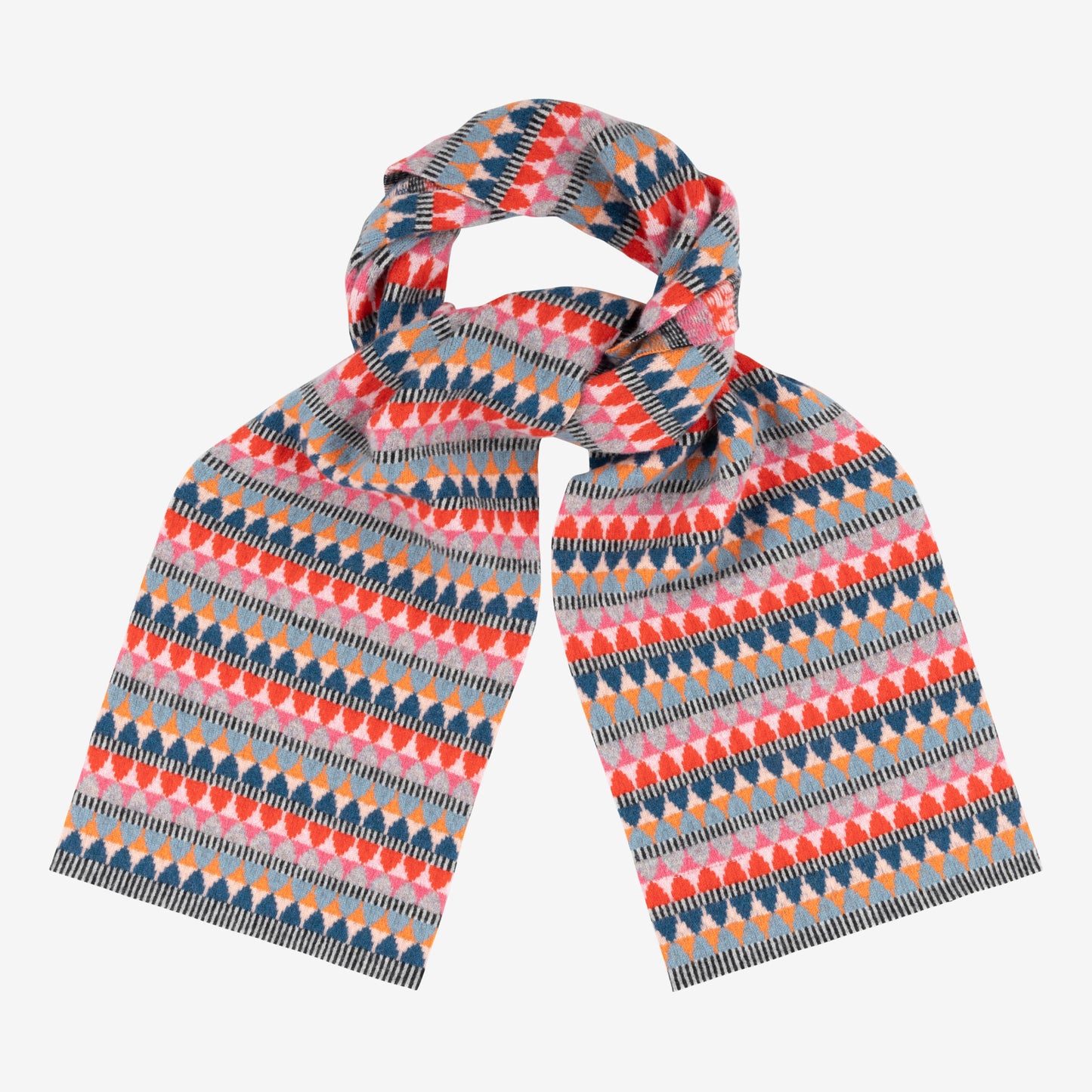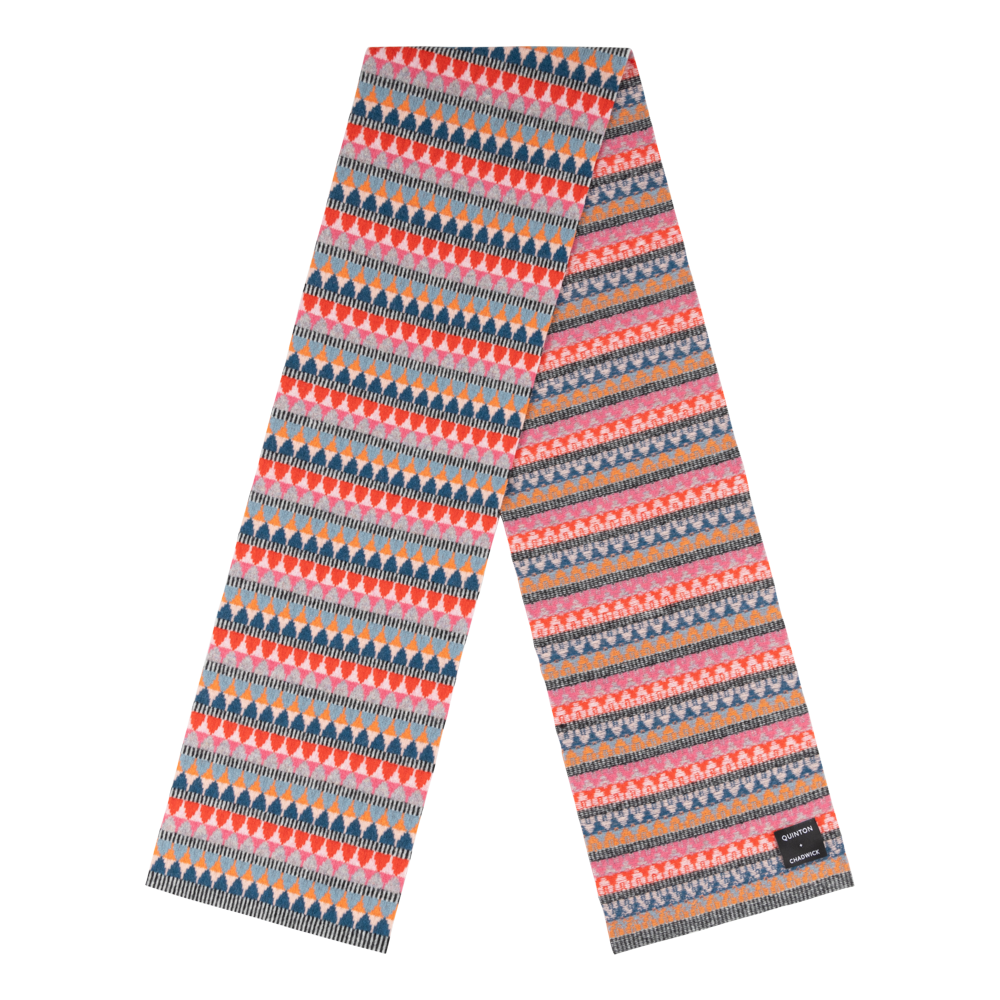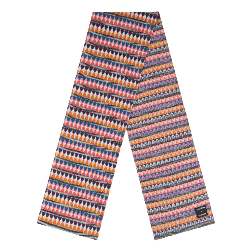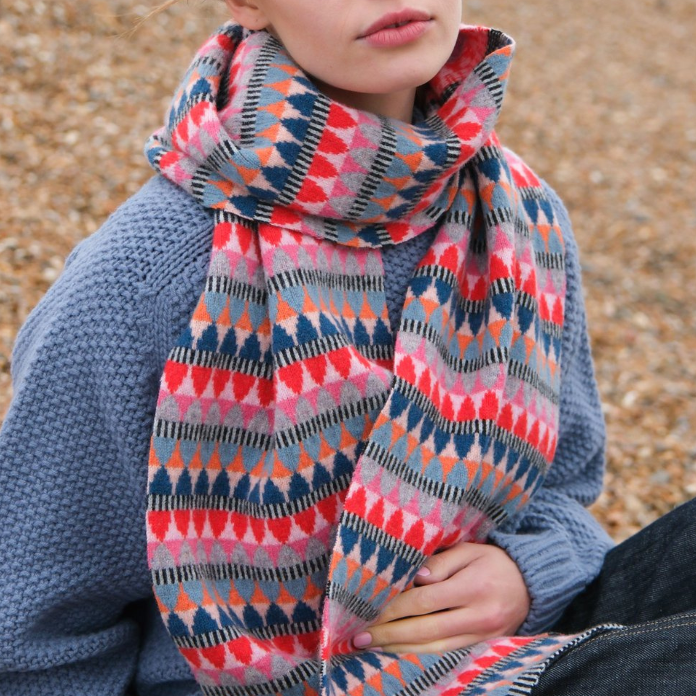The Quinton & Chadwick Felted Jacquard Scarf is a riot of colour and texture. With triangle and tiny checkerboard patterns in classic retro seaside colours. Vibrant jasper red, pomegranate pink and burnt orange fade through nautical blues and nero navy.