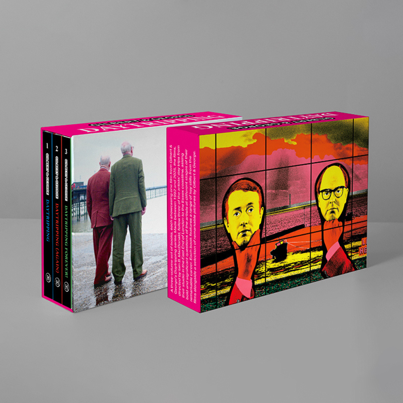 Gilbert & George, one of the most significant artist duos of our time, created their three-film series Daytripping between 1992 and 2025. This three-volume set of books showcases Daytripping, Daytripping (Again) and Daytripping Forever! Directed by Southend-on-Sea-born British film and television director Iain B. MacDonald, the films follow three of the artists’ day trips from their studio, famously located in the East End of London, to the Essex coastline, asking bold and significant questions of the artists at different stages of their remarkable career.