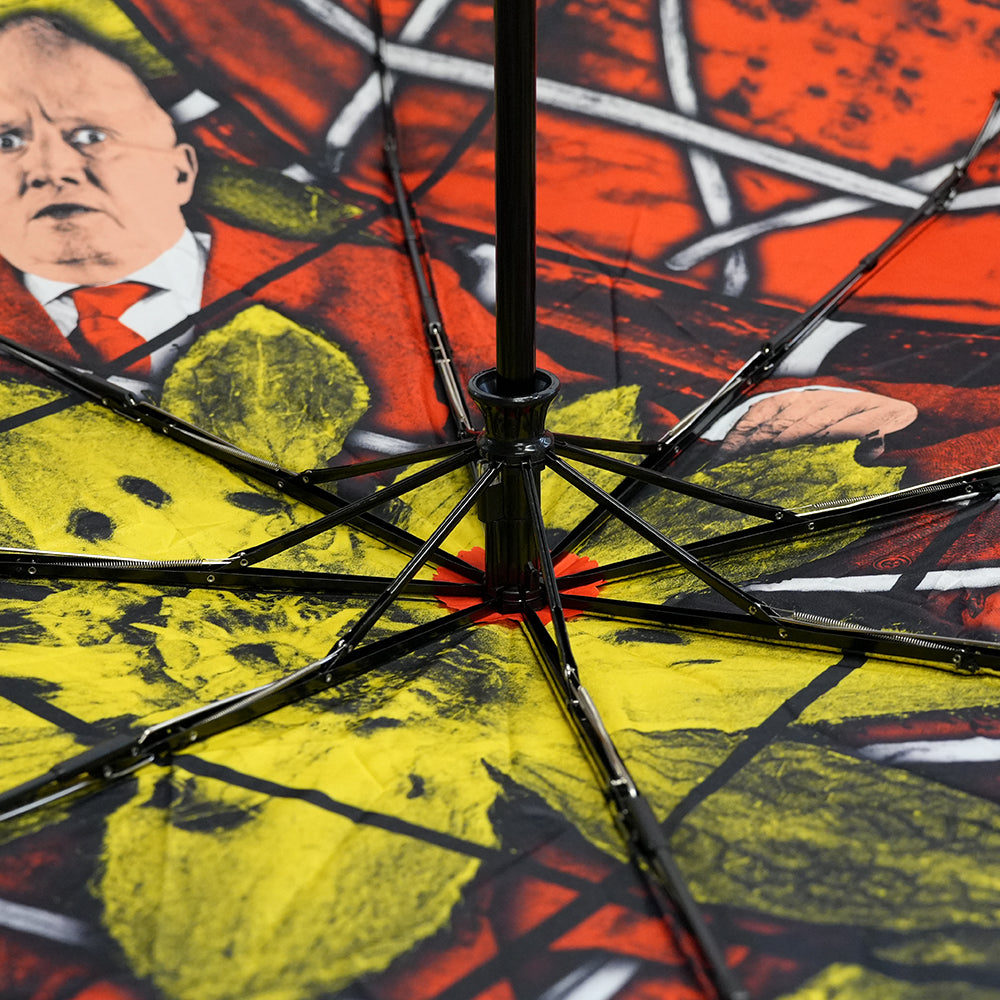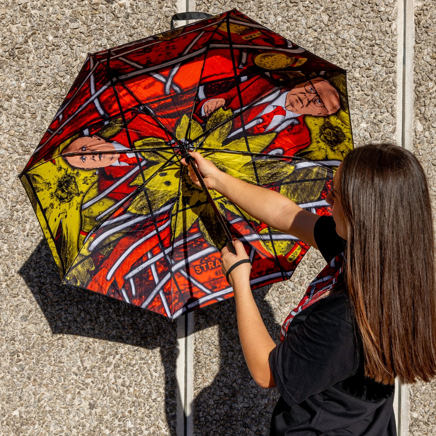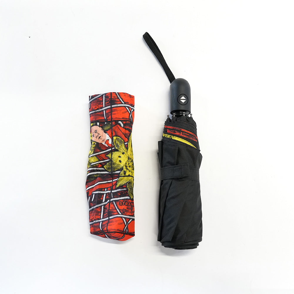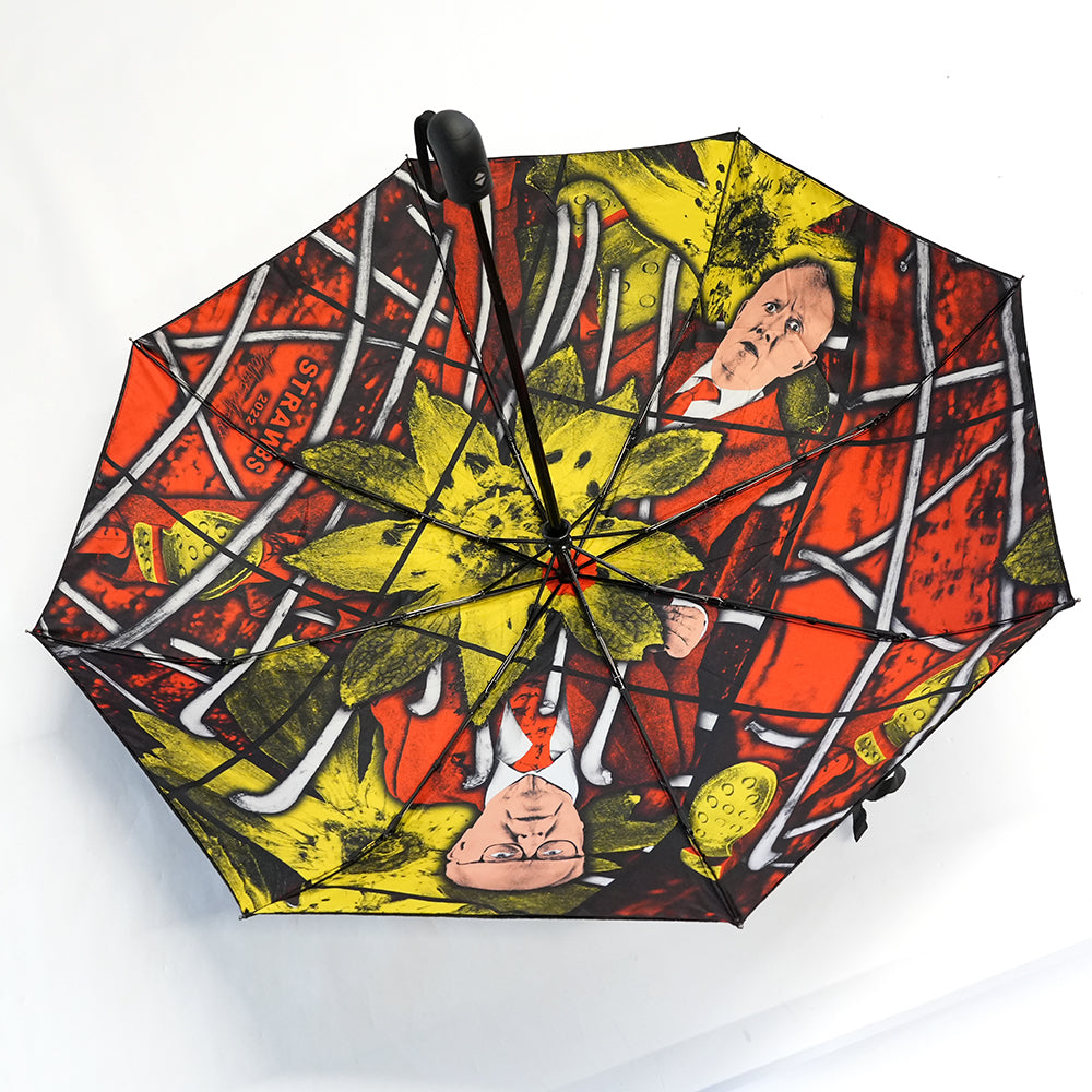 Umbrella featuring Gilbert & George's work STRAWBS, 2022 on the inside and umbrella case. Exclusively designed for the 21ST CENTURY PICTURES exhibition at the Hayward Gallery.