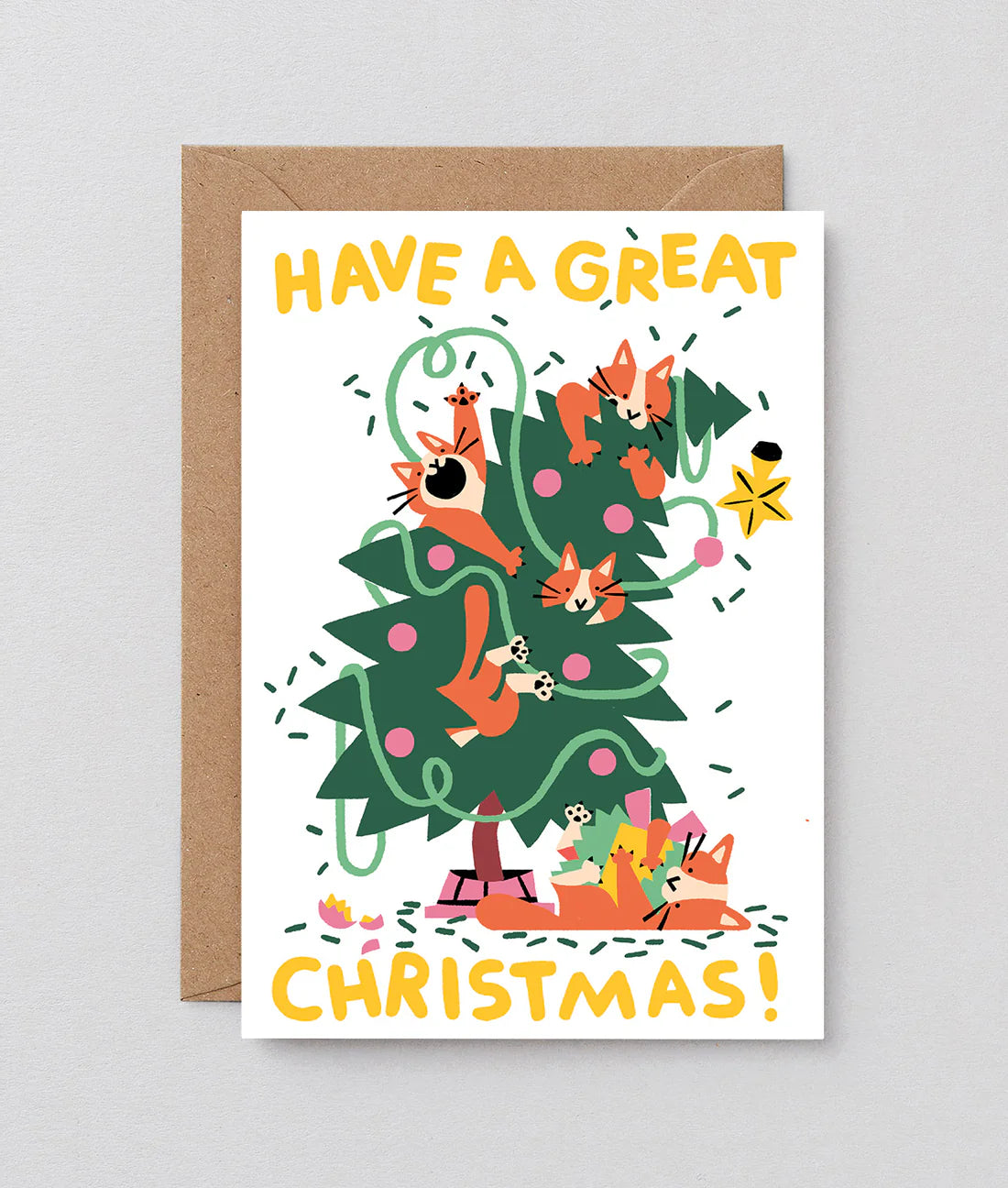 Christmas is a time for rest and relaxation. Unless you have cats. This Christmas card full of kitty chaos is designed in a colourful and energetic style and finished with embossed detailing.
