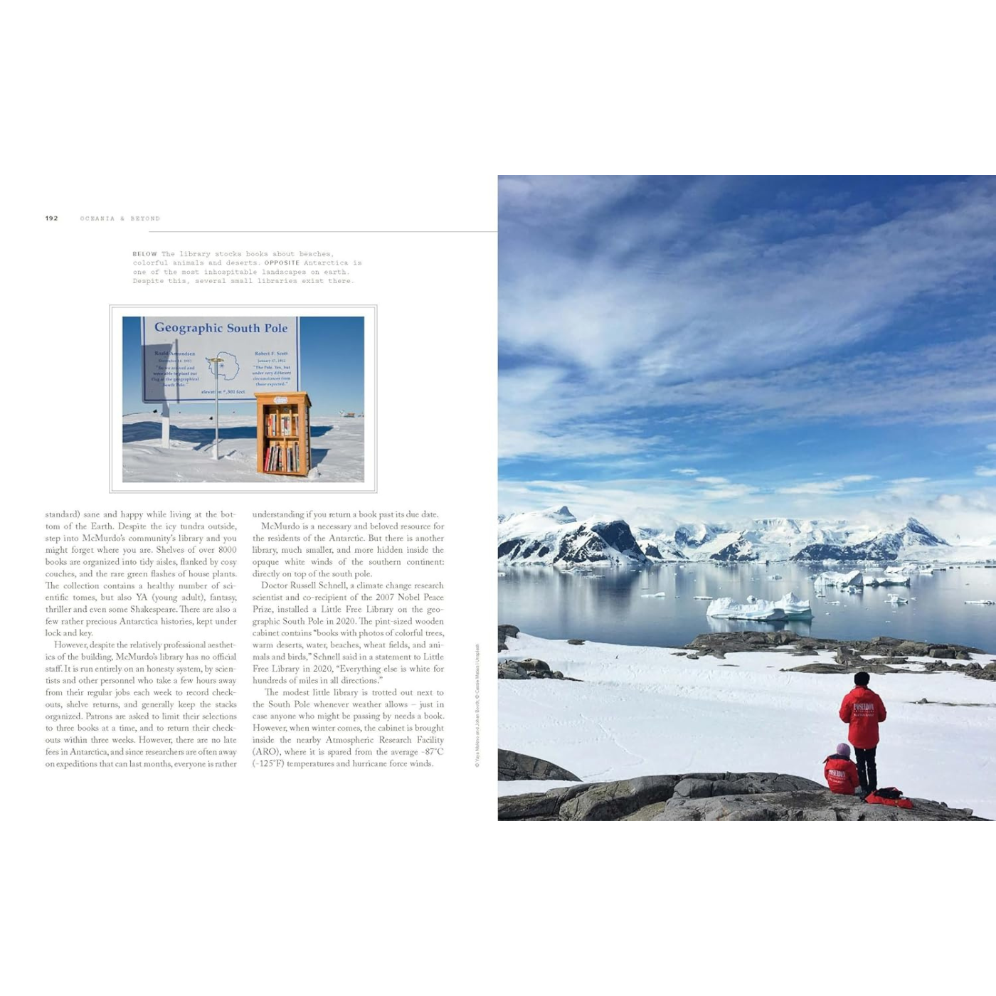 Featured libraries include: North America - Idaho: Little Free Library in a Cottonwood Tree; California: The Prison Library Project. South America - Argentina: The Weapon of Mass Instruction; Colombia: The Biblioburro. Africa - Egypt: St Catherine's Monastery; Mali: The Timbuktu Manuscripts. Asia & the Middle East - China: The Lonely Library; Philippines: Reading Club 2000. Europe - England: Phone Booth Library; Norway: The Future Library. Oceania & Beyond - Antarctica: The Little Free Library at the South Pole; Outer Space: The International Space Station Library