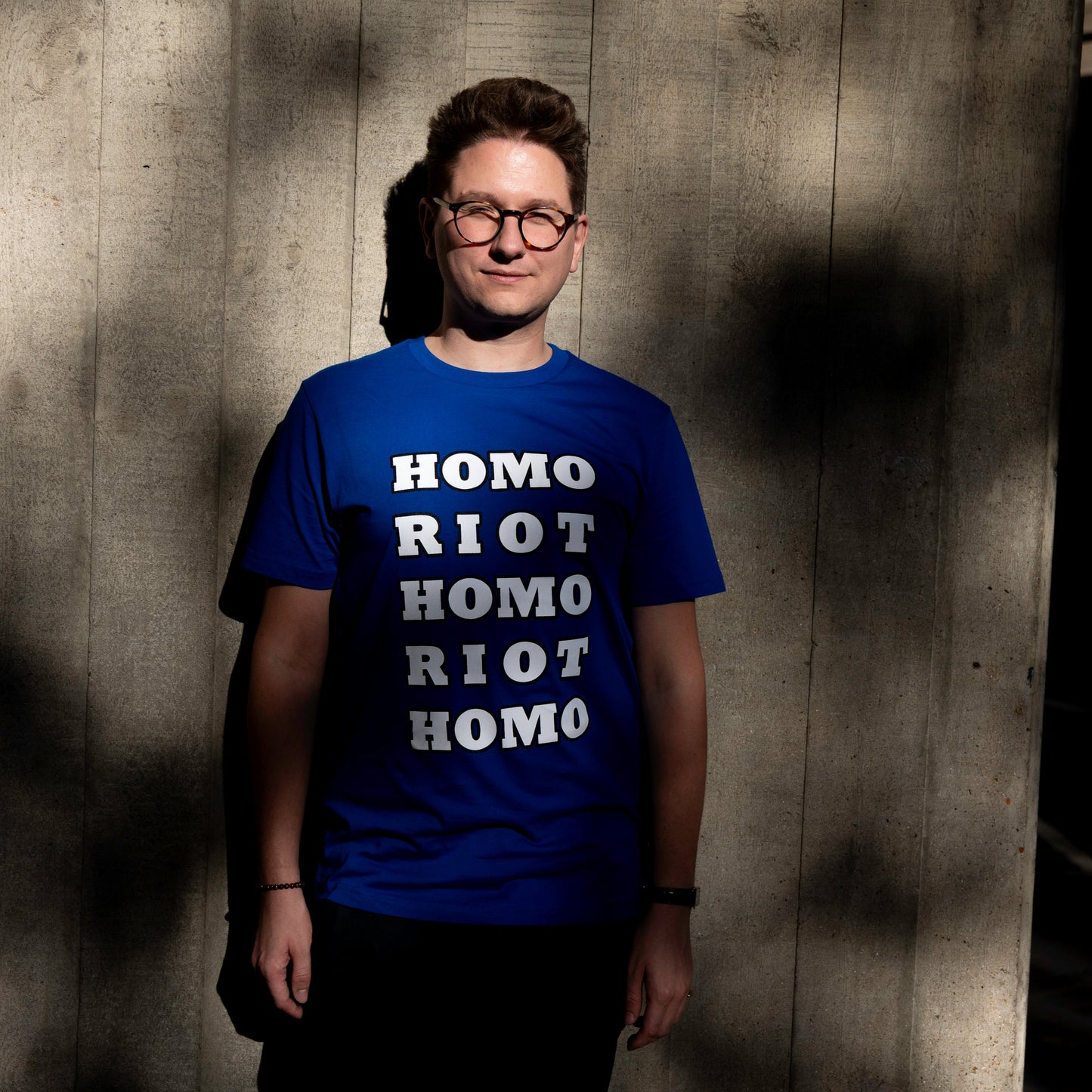 Unisex t-shirt, exclusively designed for the Hayward Gallery Shop for the 21ST CENTURY PICTURES exhibition featuring Gilbert & George artwork HOMO RIOT HOMO, 2014.