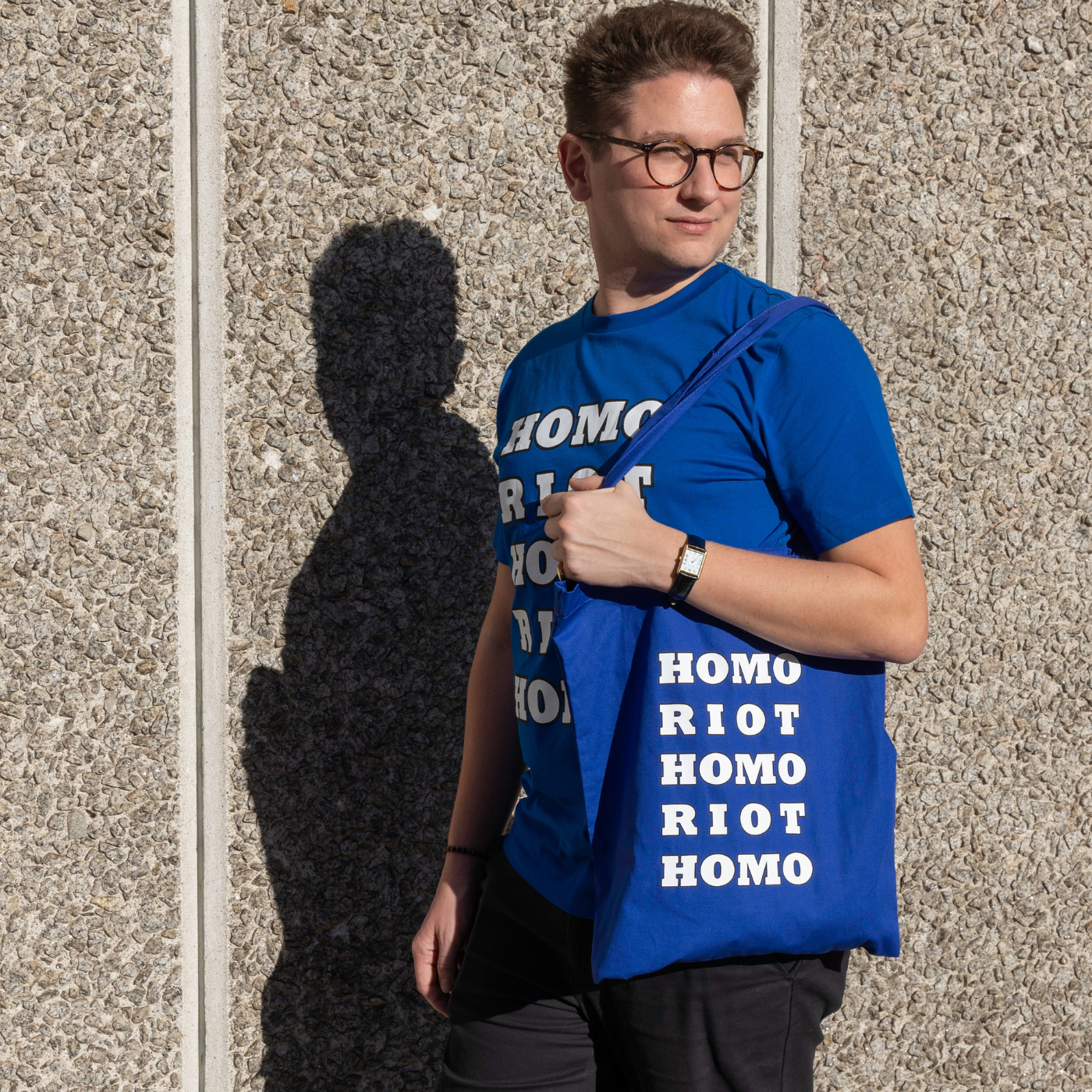 Exclusive tote bag featuring Gilbert & George's artwork HOMO RIOT HOMO, 2014 from the 21ST CENTURY PICTURES exhibition at the Hayward Gallery.