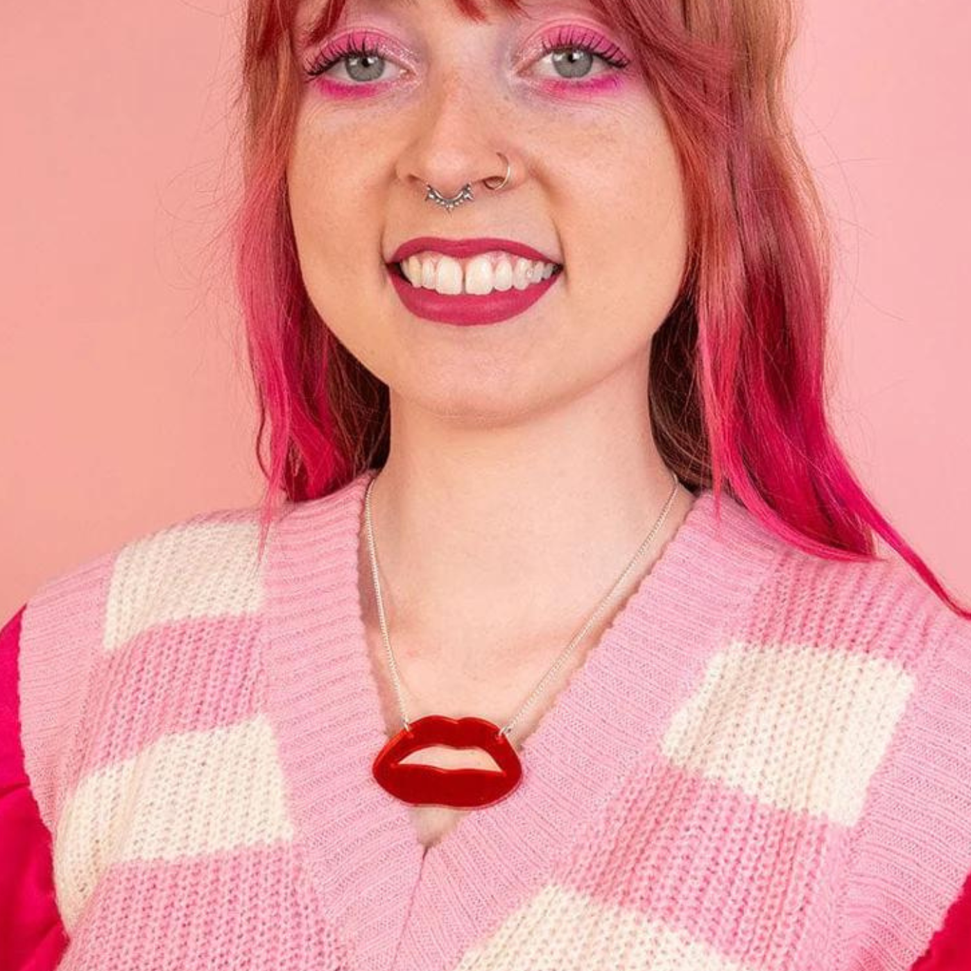 Tatty Devine recreated a luscious pout in glossy mirror red acrylic, laser cut in their Kent studio and hand linked to a silver-plated chain by their team of talented beauticians, sorry, jewellery makers!