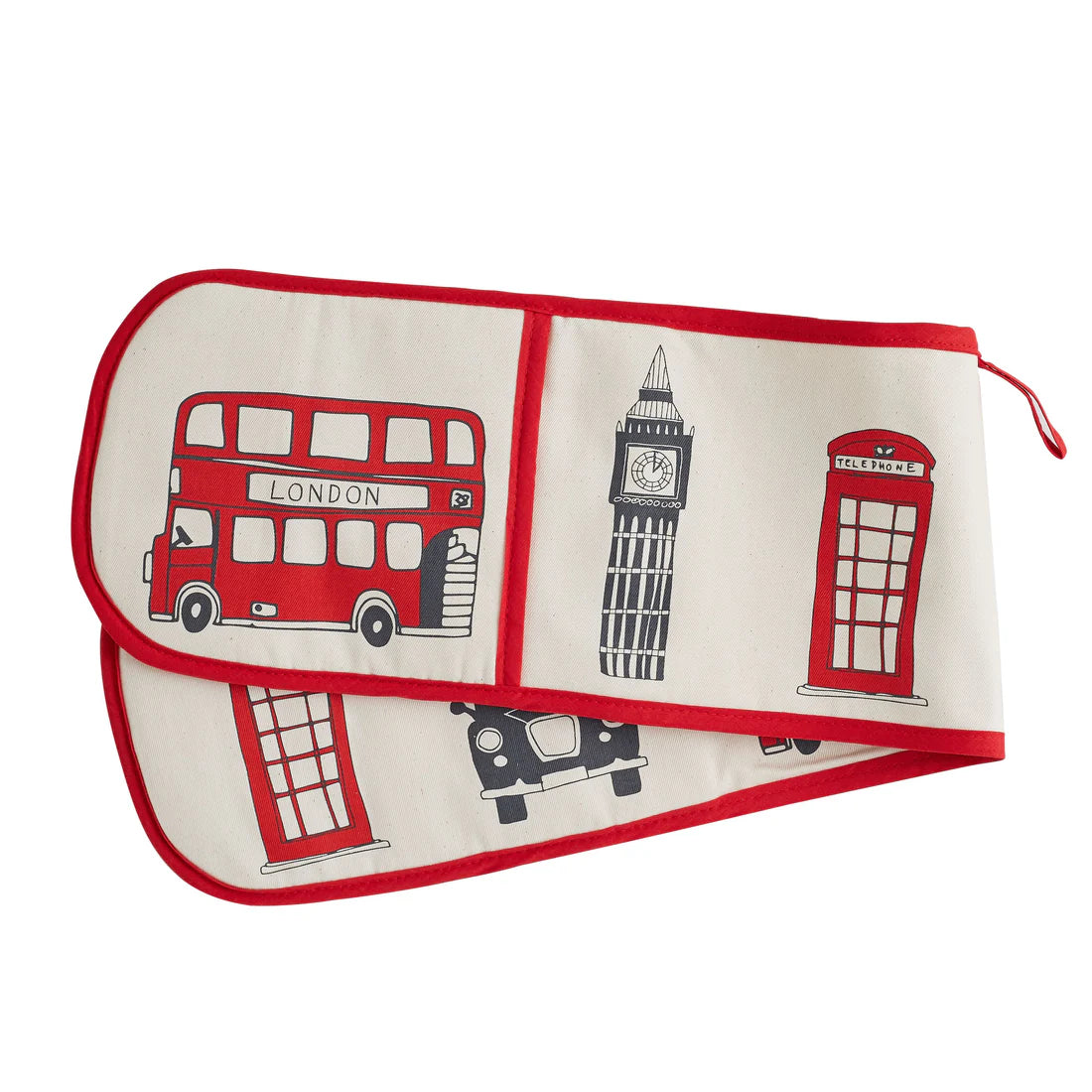 This bold London Skyline oven glove highlights 6 London icons so associated with Britishness that tourists can often been seen posing beside them, and serves as a reminder of everything you love about London. The whimsical illustrations include Big Ben, the London Eye, London bus, taxi, post box and telephone box. This double oven glove by Victoria Eggs will protect your hands and add some London charm to your kitchen.