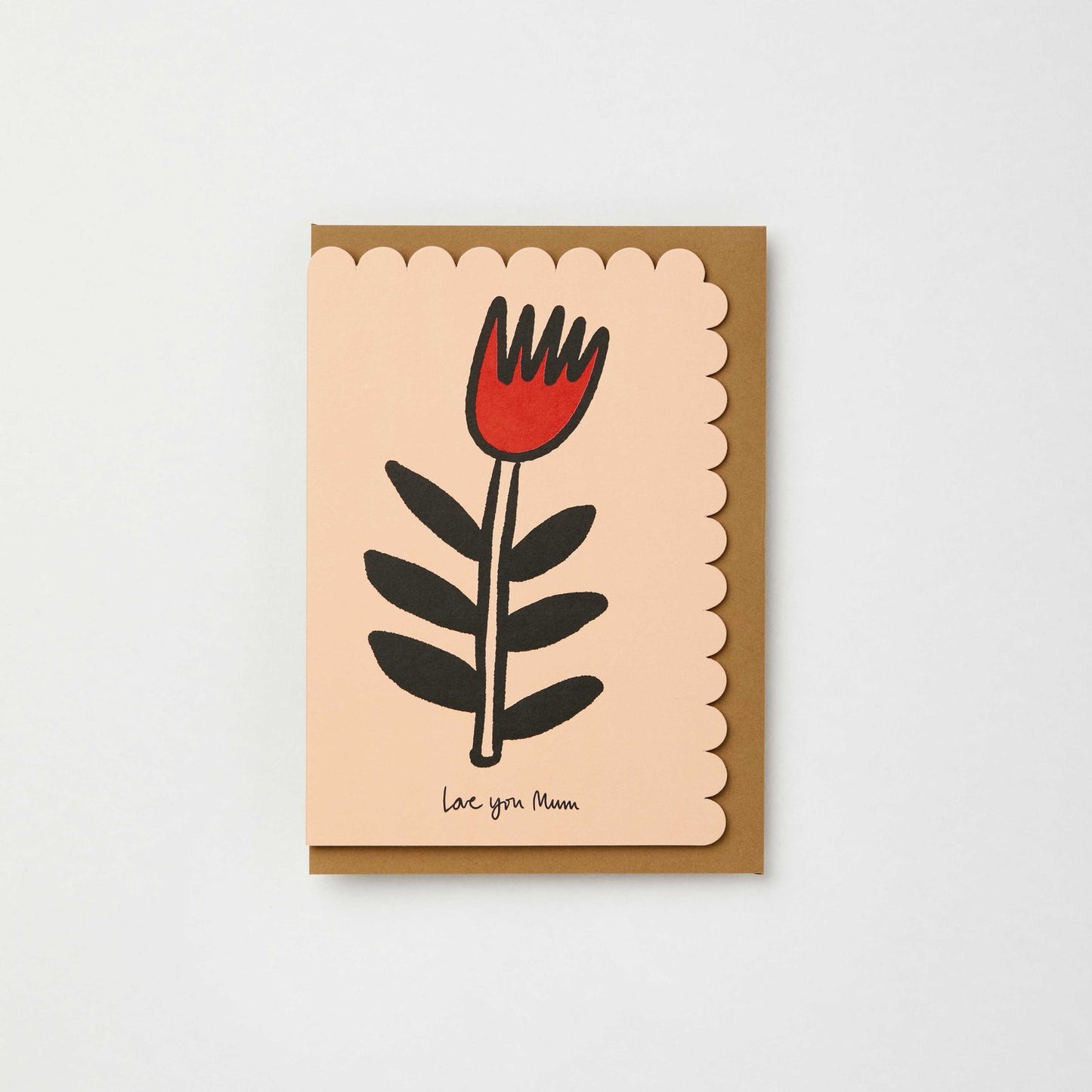 A card perfect for Mother's Day or a birthday, this pink card features a red flower with handwritten 'love you mum'...finished off with a dye cut, scalloped edge.