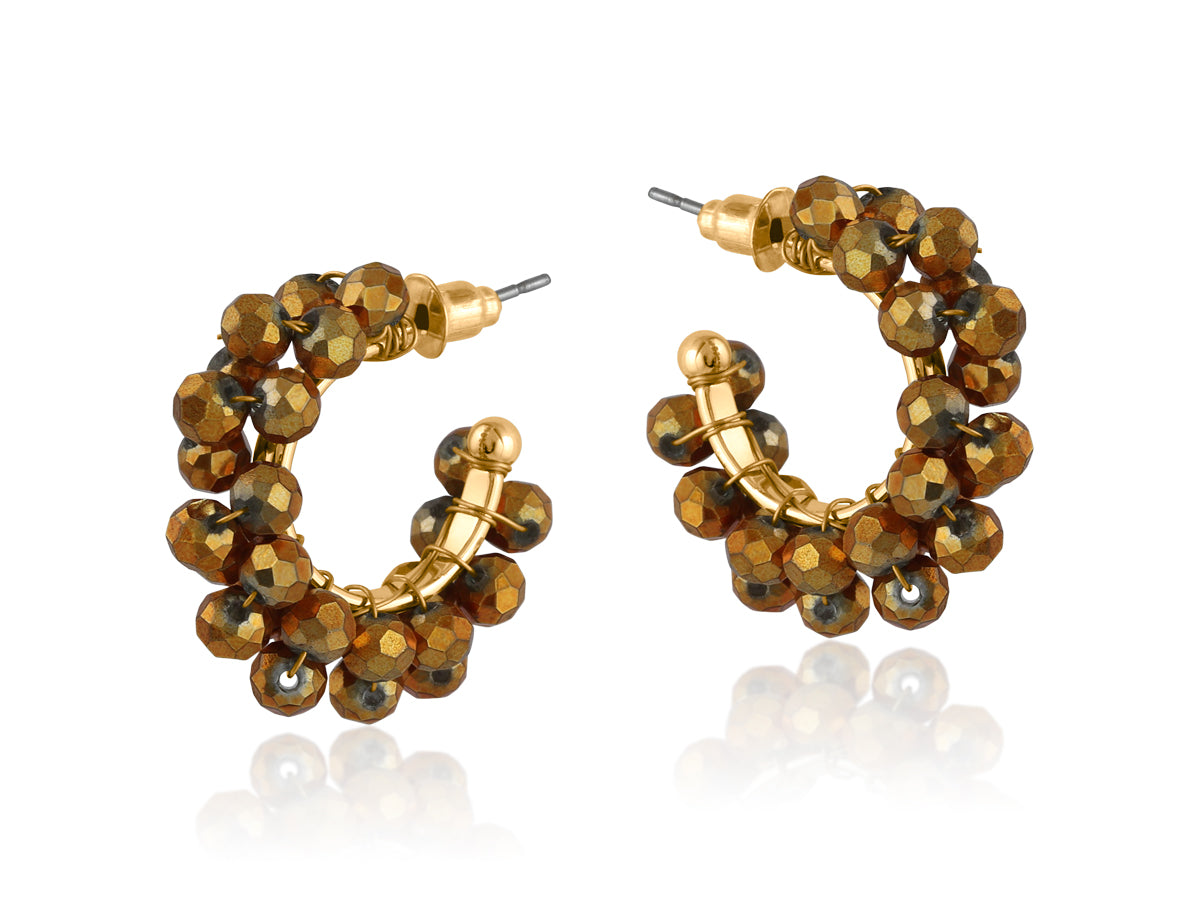 These eye-catching hoop earrings adorn colourful hand-cut glass beading with gold plated settings. Wear solo or team with simple gold hoops.