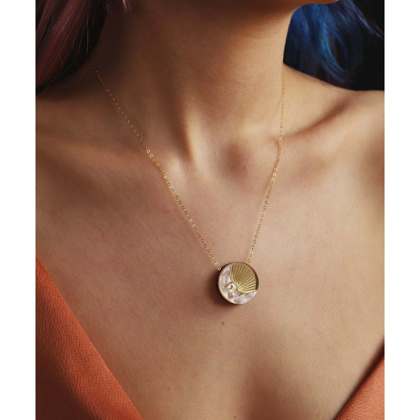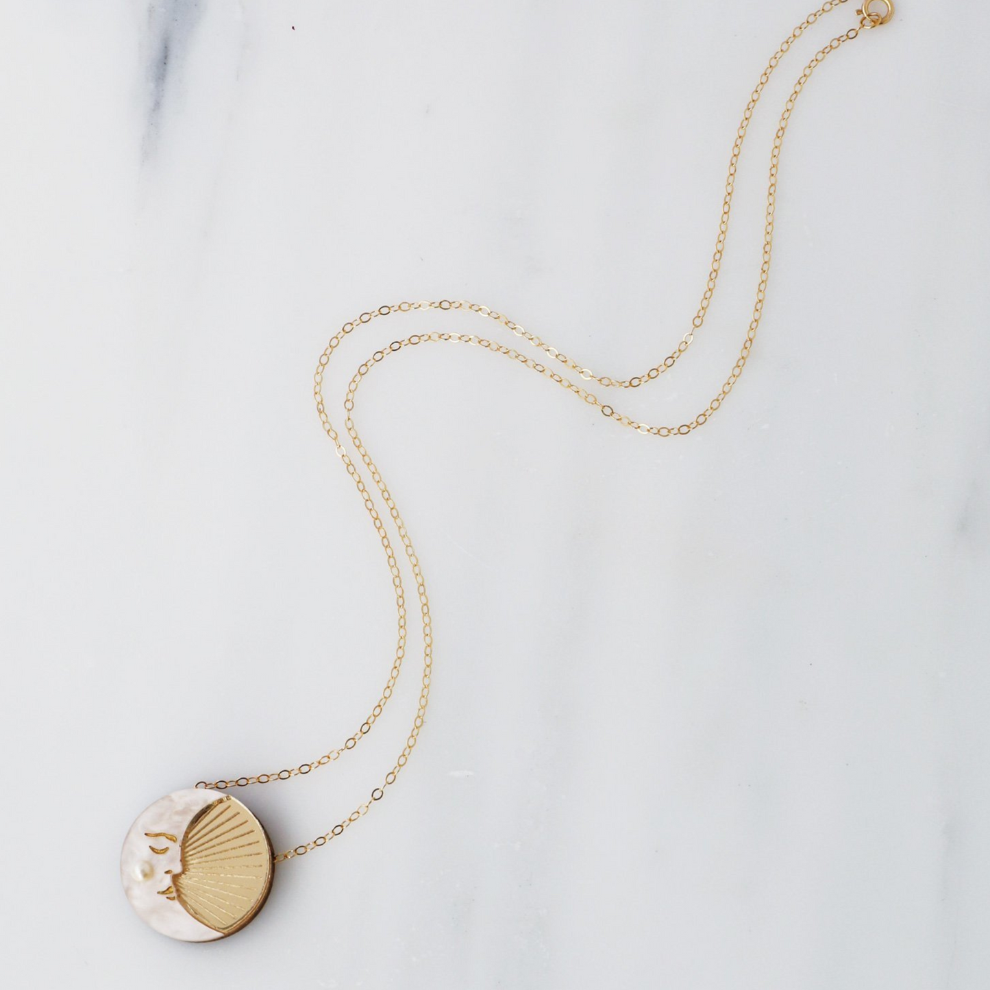 Moon necklace made using gold mirror acrylic and cream marbled acrylic with hand-inked surface illustration and Czech glass pearl detail.