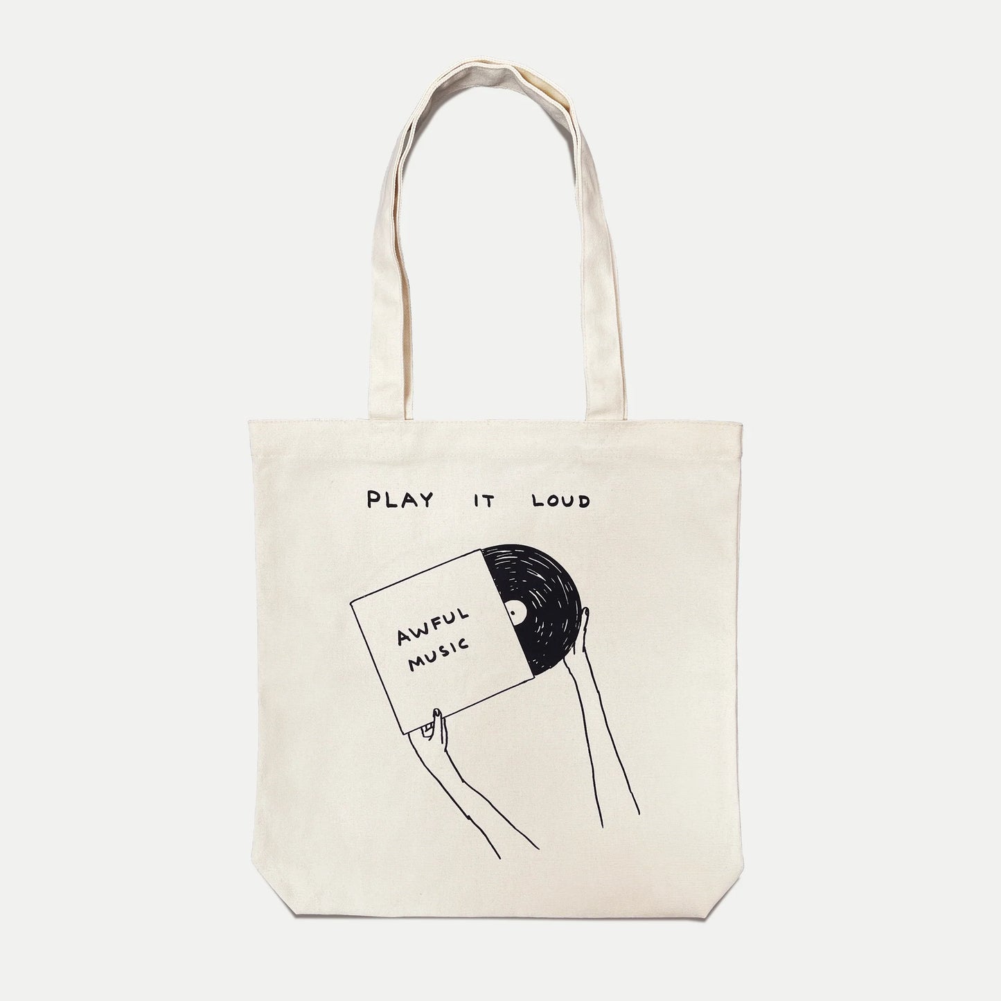 Woven tote bag in natural canvas with black Play It Loud print on the front and Shrig Shop logo on the reverse.