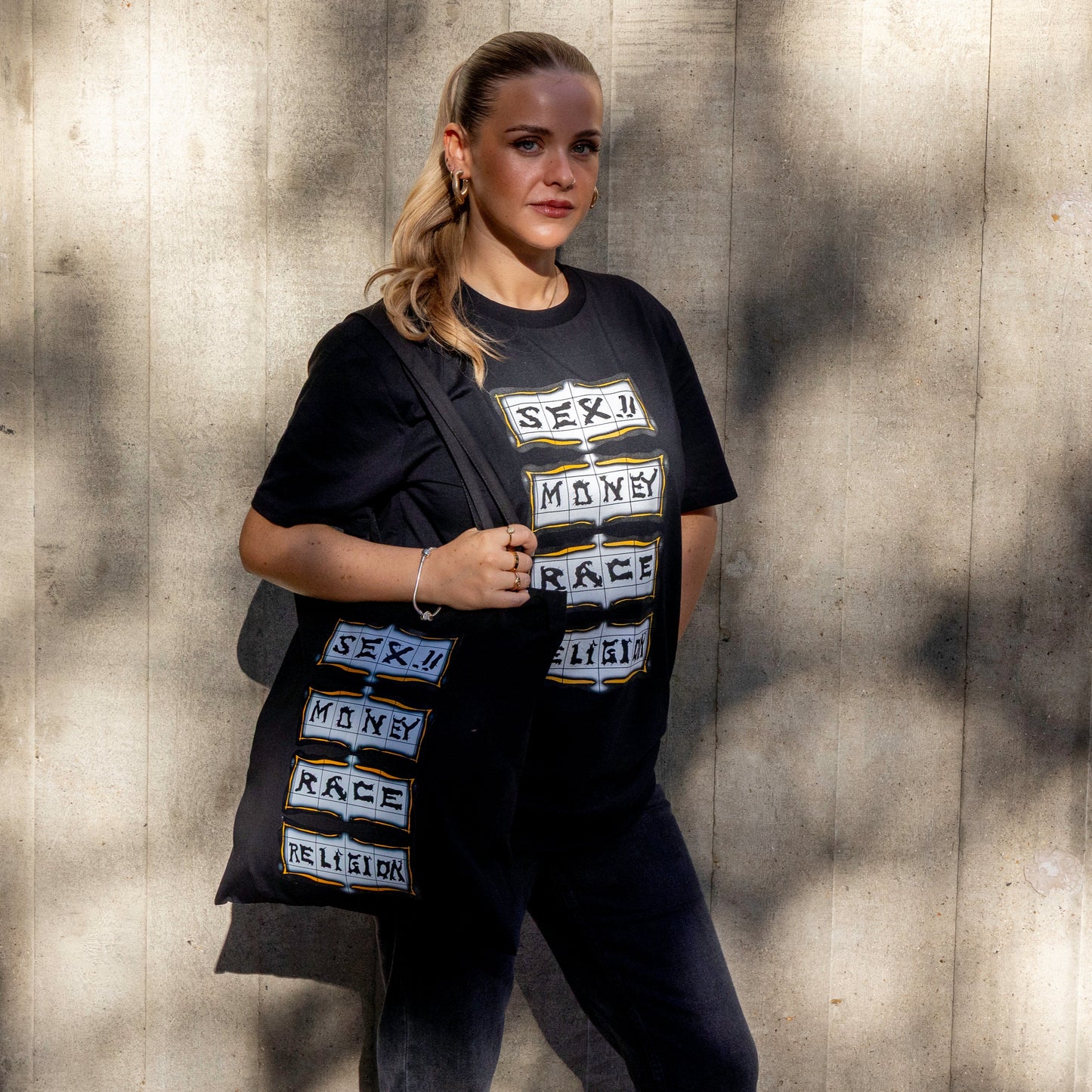 Unisex t-shirt, exclusively designed for the Hayward Gallery Shop for the 21ST CENTURY PICTURES exhibition inspired by Gilbert & George artwork SEX MONEY RACE RELIGION, 2016.