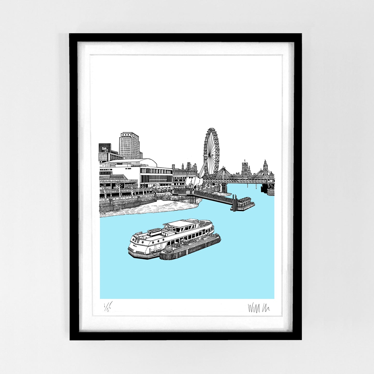 Hand-printed, limited edition screen print from original hand drawing. The River Thames printed with a light blue colour.