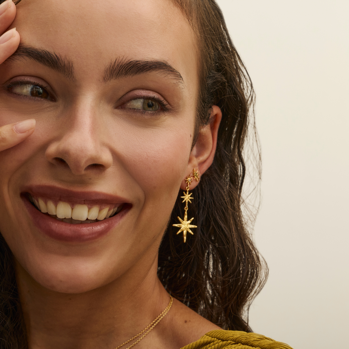 These 18ct gold-plated recycled brass earrings by Ottoman Hands feature three cascading stars, the first set with twinkling white cubic zirconia. Symbolising dreams, direction and destiny, they create gentle movement and subtle sparkle. A must-have for cosmic charm with a modern feel.