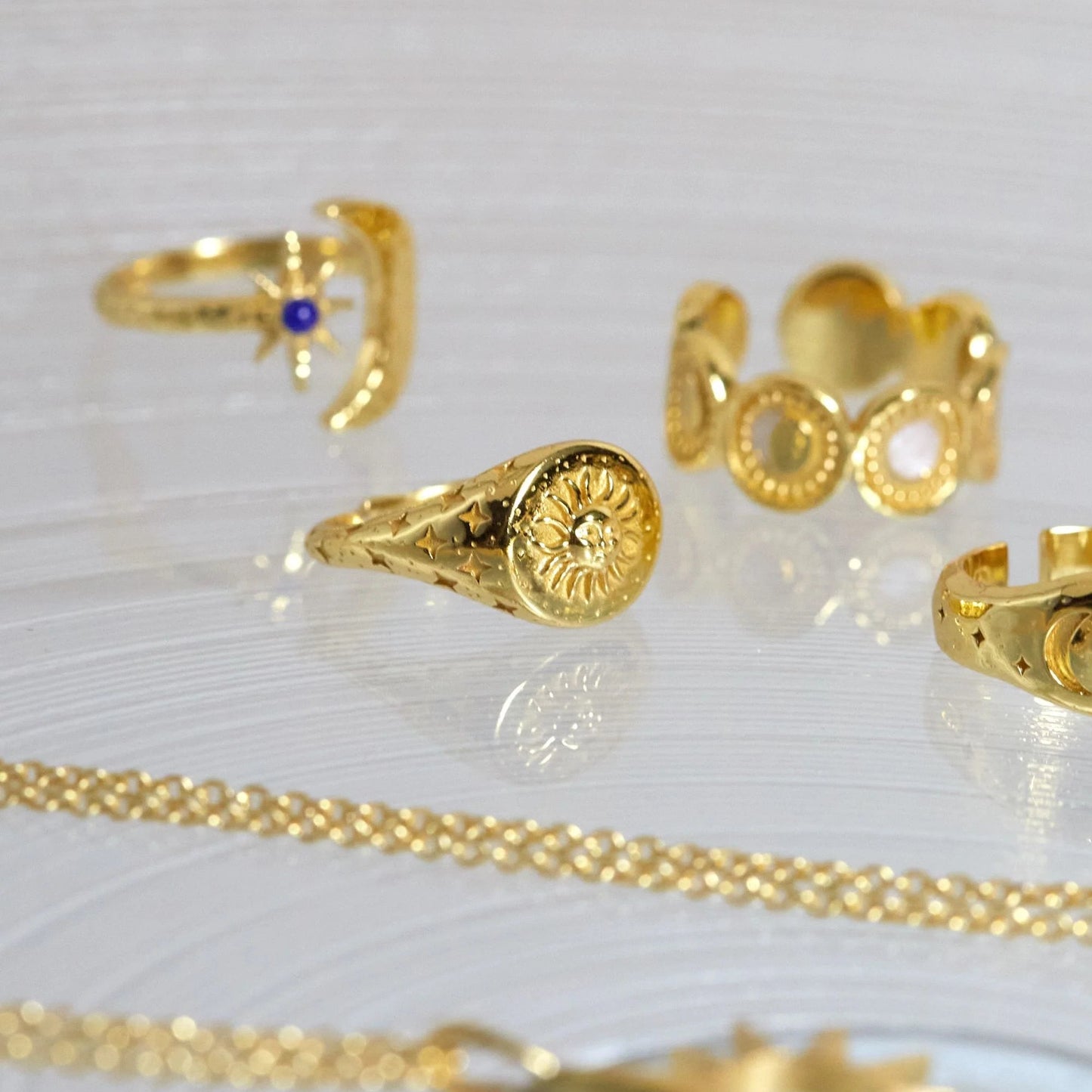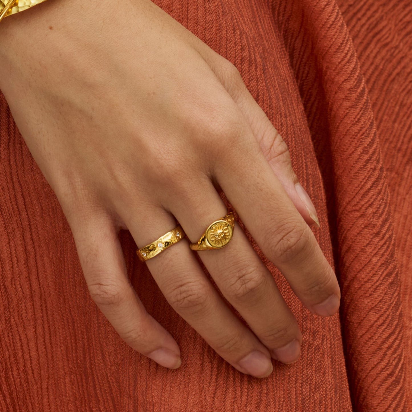 Made from 18ct gold-plated sterling silver, this modern signet ring features a radiant sunray design. The sun symbol represents vitality, joy and new beginnings. Bold yet refined, it's a standout piece with everyday wearability.