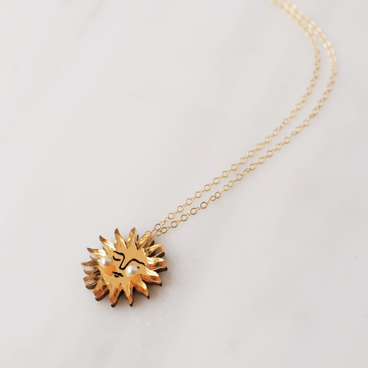 - Gold mirror acrylic with hand inked illustration details and Czech glass pearls on FSC approved wood. 45cm 14k gold-filled chain