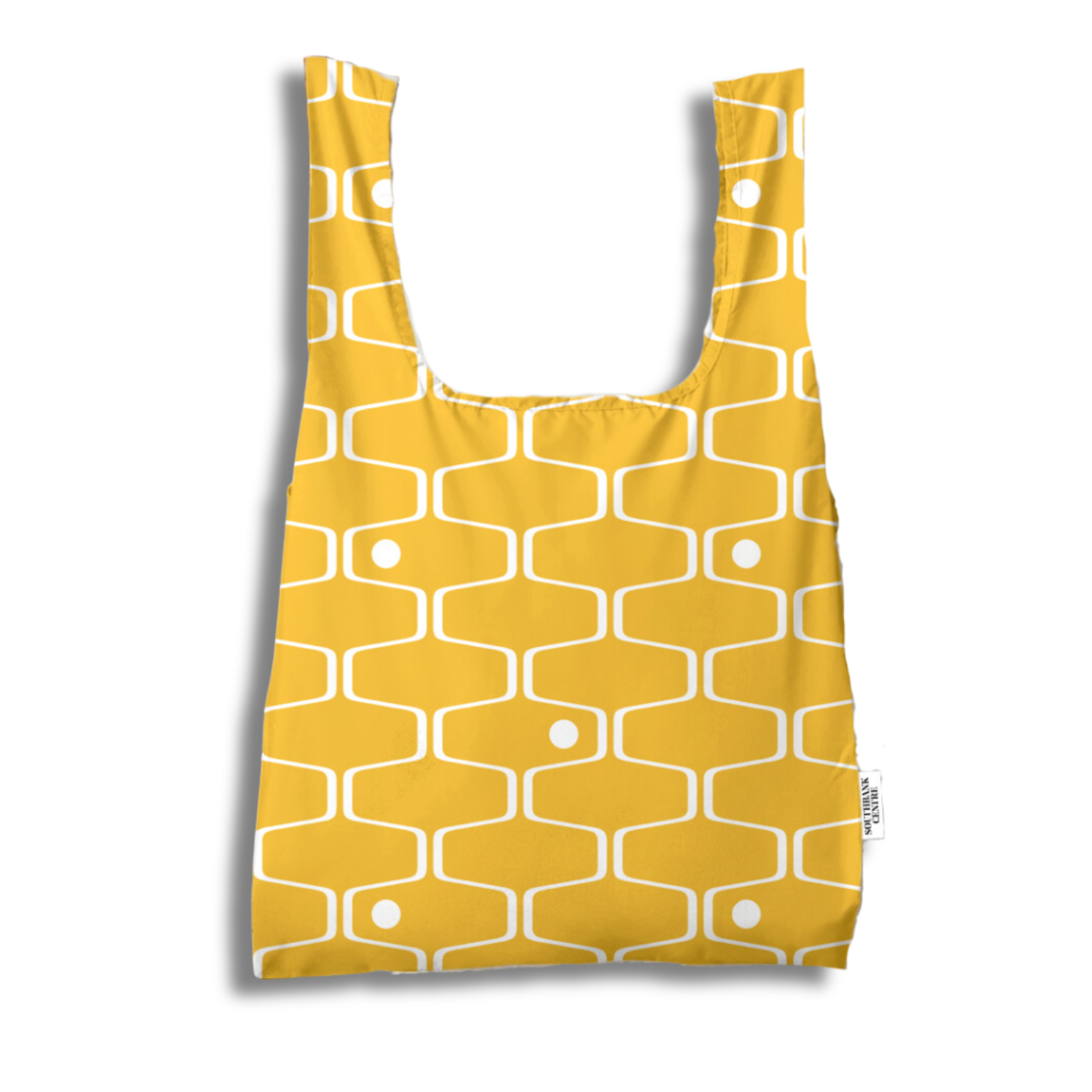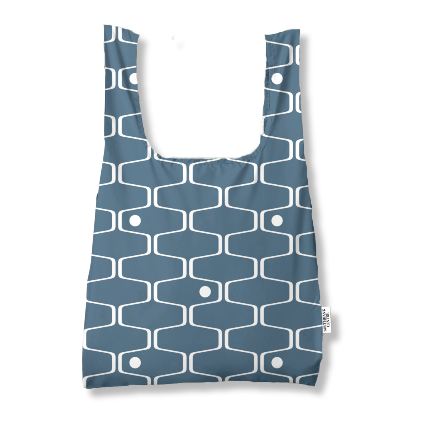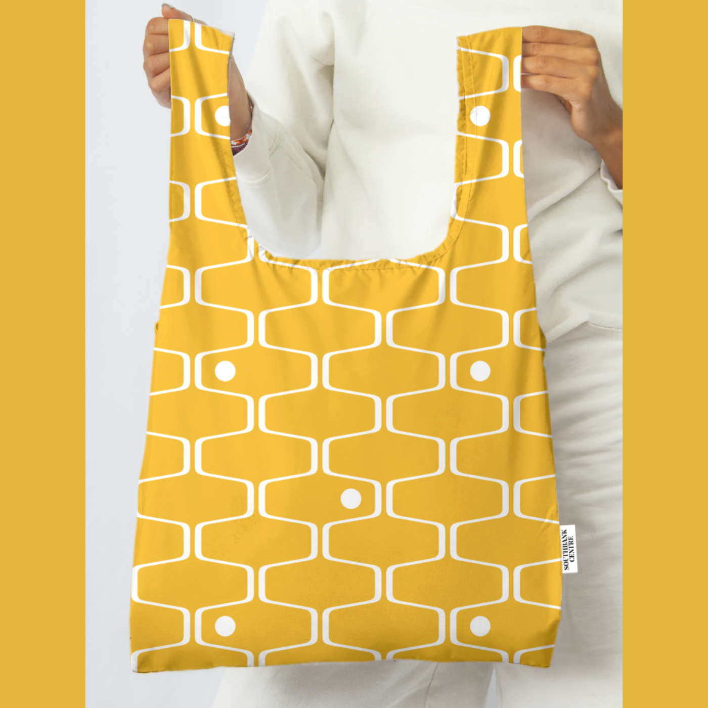 A 100% recycled material shopping bag featuring the pattern known as 'Net & Ball' which was originally created by Peter Moro and Leslie Martin for the carpet in Royal Festival Hall when it opened at the Festival of Britain in 1951. It is based on a square wave seen with an oscilloscope - the visual representation of sound.