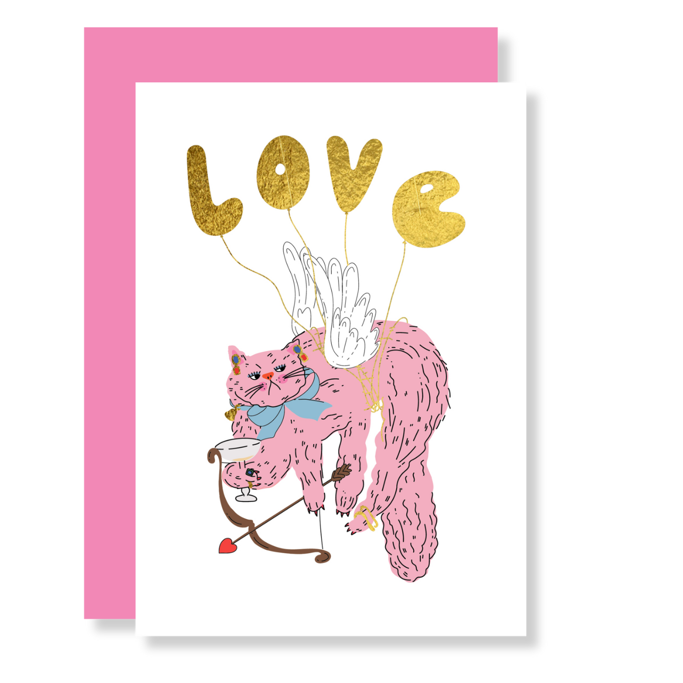 A greeting card with a black and white illustration of a cat and a neon yellow envelope.