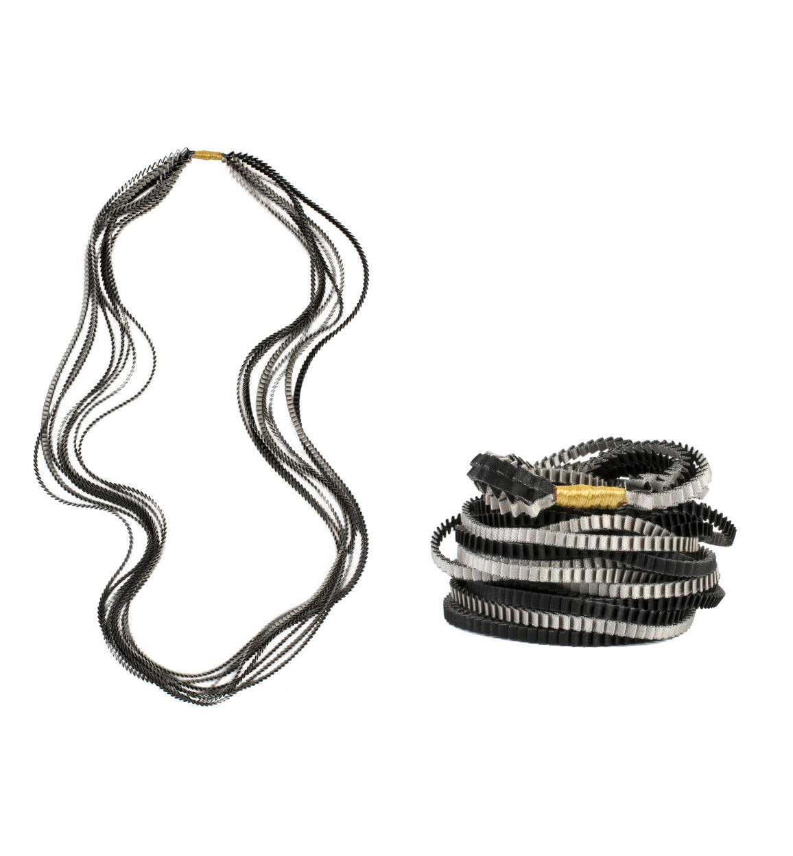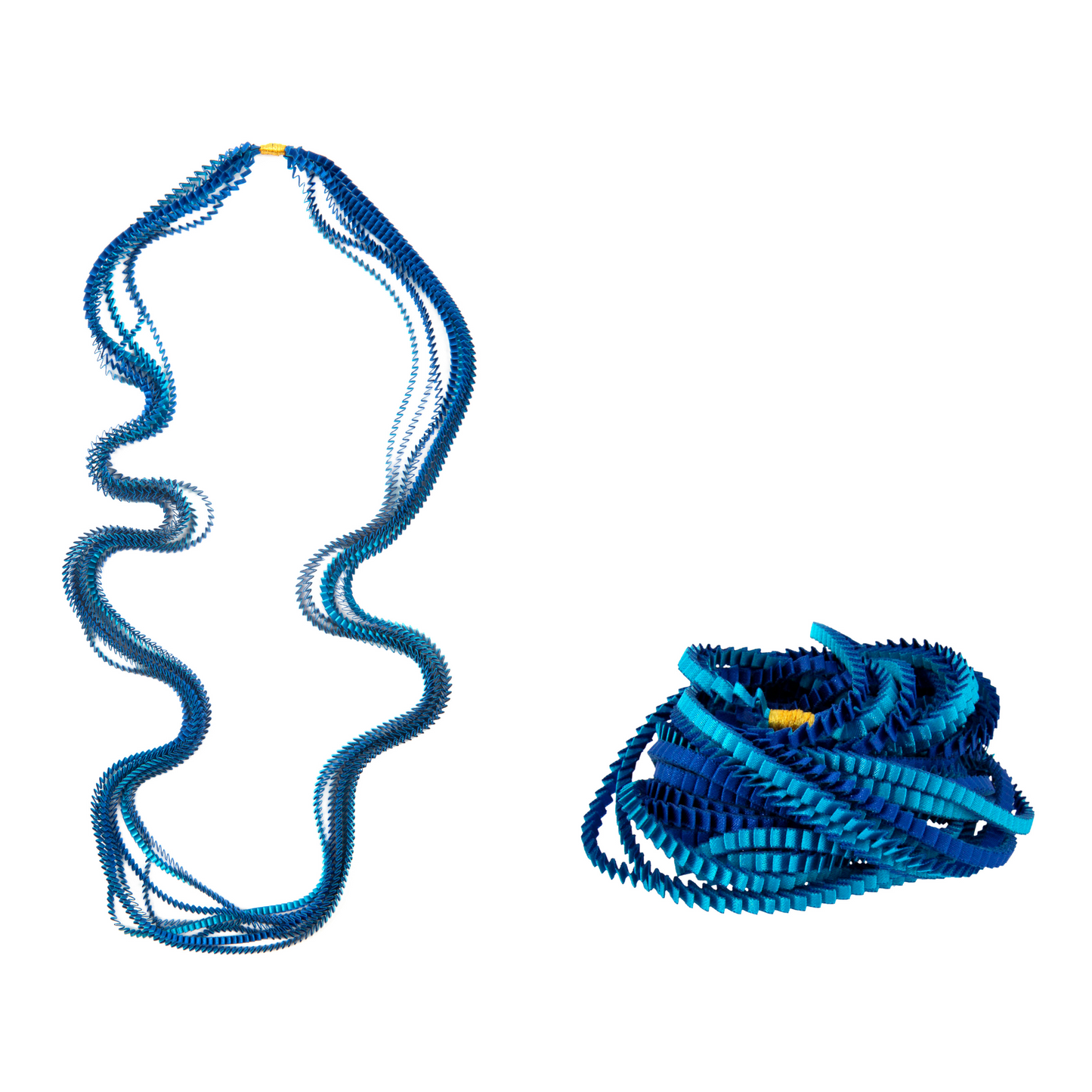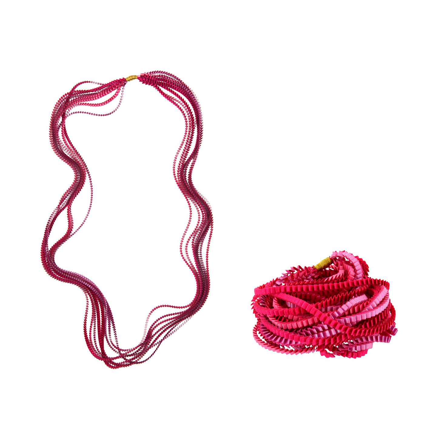 These beautiful necklaces by Alexandra Tsoukala are made of pleated fabric (satin polyester), which gives them a slight shimmer and ensures their elasticity and durability.