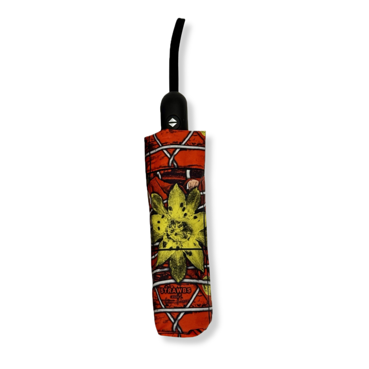 Umbrella featuring Gilbert & George's work STRAWBS, 2022 on the inside and umbrella case. Exclusively designed for the 21ST CENTURY PICTURES exhibition at the Hayward Gallery.