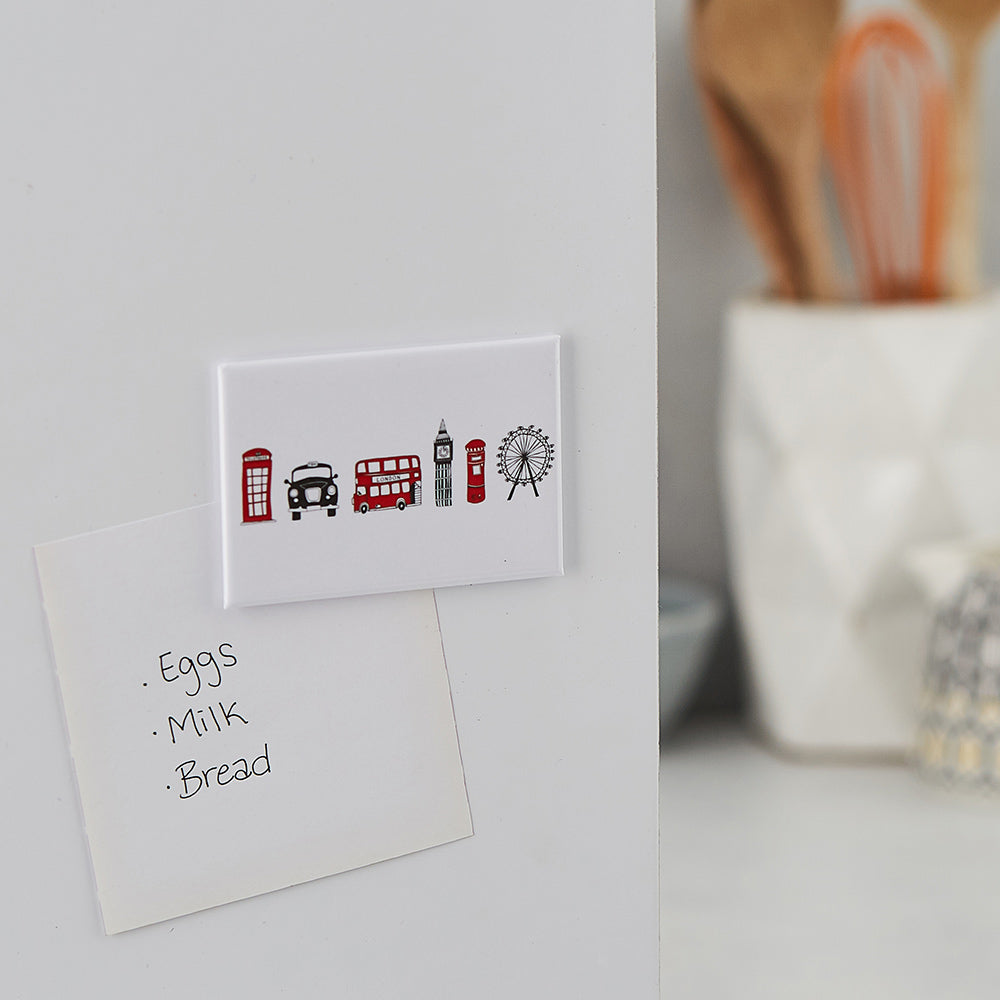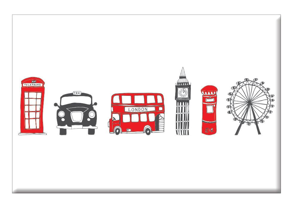 This bold London Skyline magnet features 6 London icons so associated with Britishness that tourists can often been seen posing beside them, and serves as a reminder of everything you love about London. They include Big Ben, the London Eye, London bus, taxi, post box and telephone box. This London magnet by Victoria Eggs is a perfect souvenir of your trip to the Big Smoke!