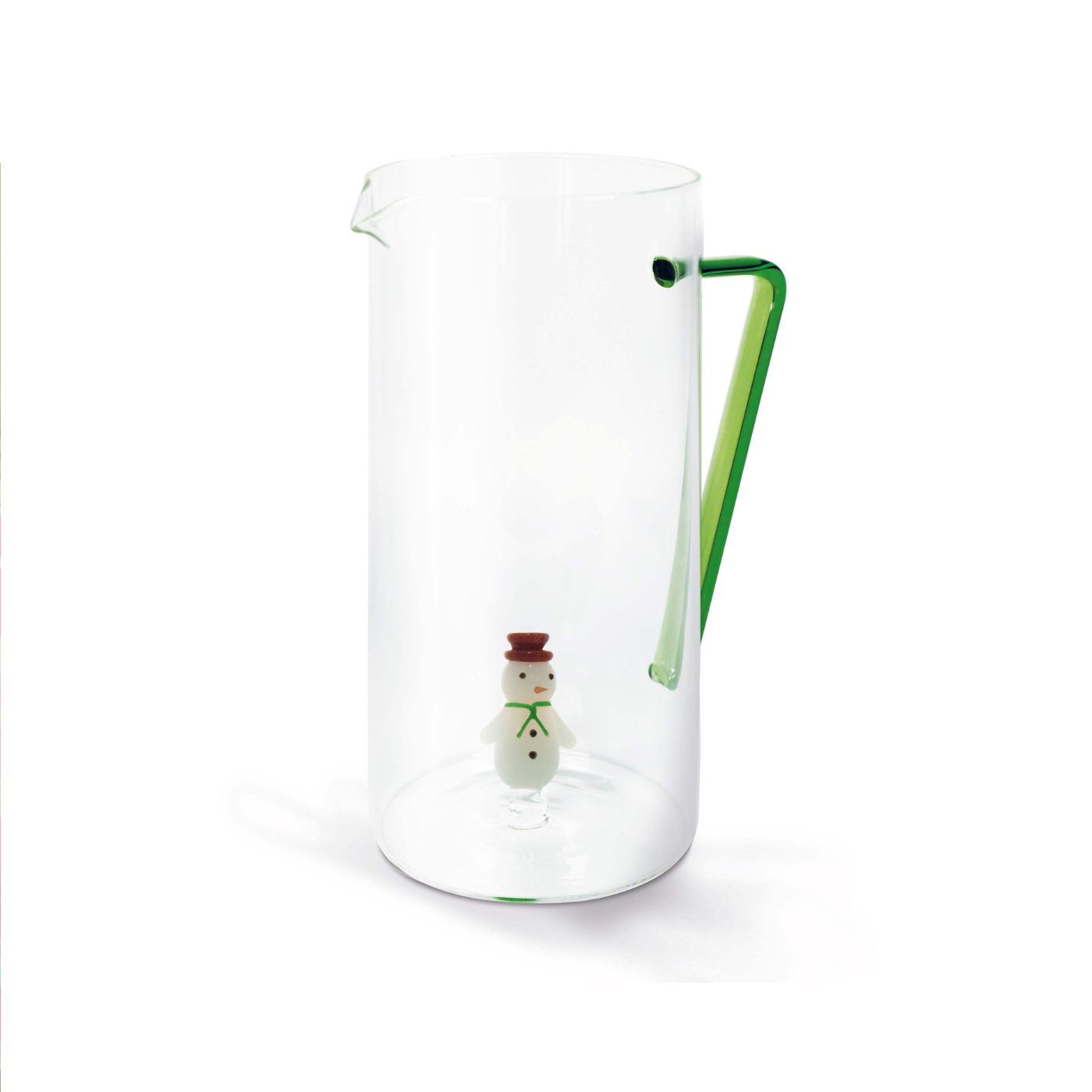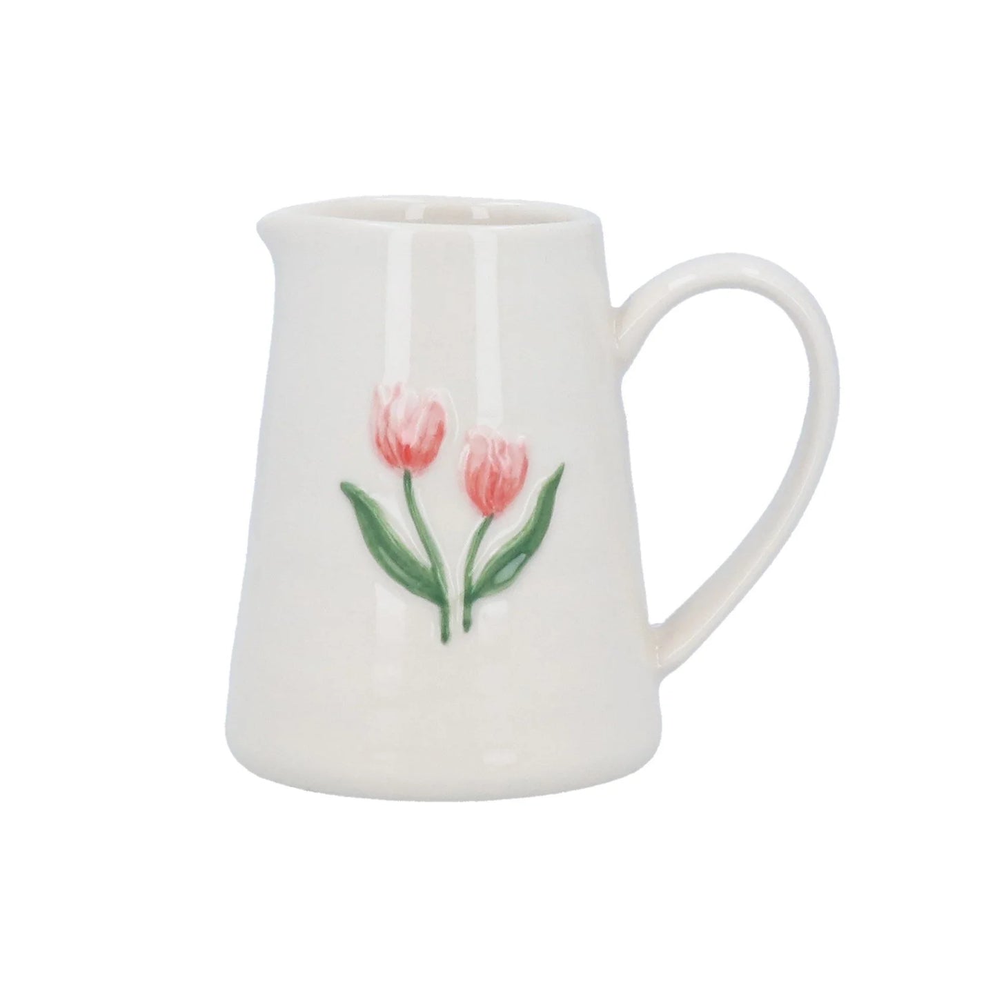 Ceramic pitcher with face patterns holding a single pink flower against a plain background
