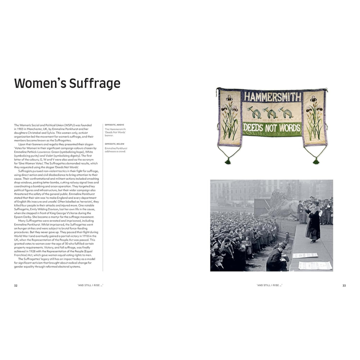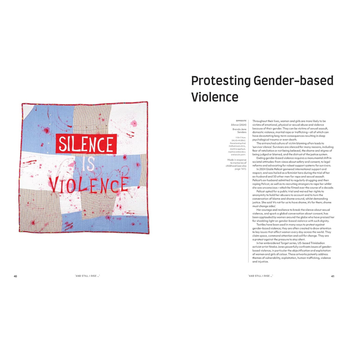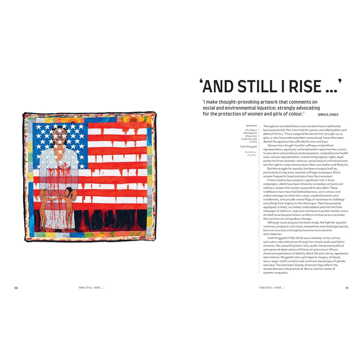 The book is thoughtfully illustrated with examples that include heavily embroidered suffragette and trade union banners, the knitted pussyhats of the 2017 Women’s March, protest textiles from the Guerrilla Girls, Pride flags that celebrate the LGBTQ+ community, and the vast variety of textile art in support of the Black Lives Matter movement. It also covers the rich history of fine art textiles with a political theme, such as Judy Chicago’s iconic 1970s installation The Dinner Party, and includes interviews with prominent activist artists that give further insight into the way everyday materials can be repurposed to create arresting political art.