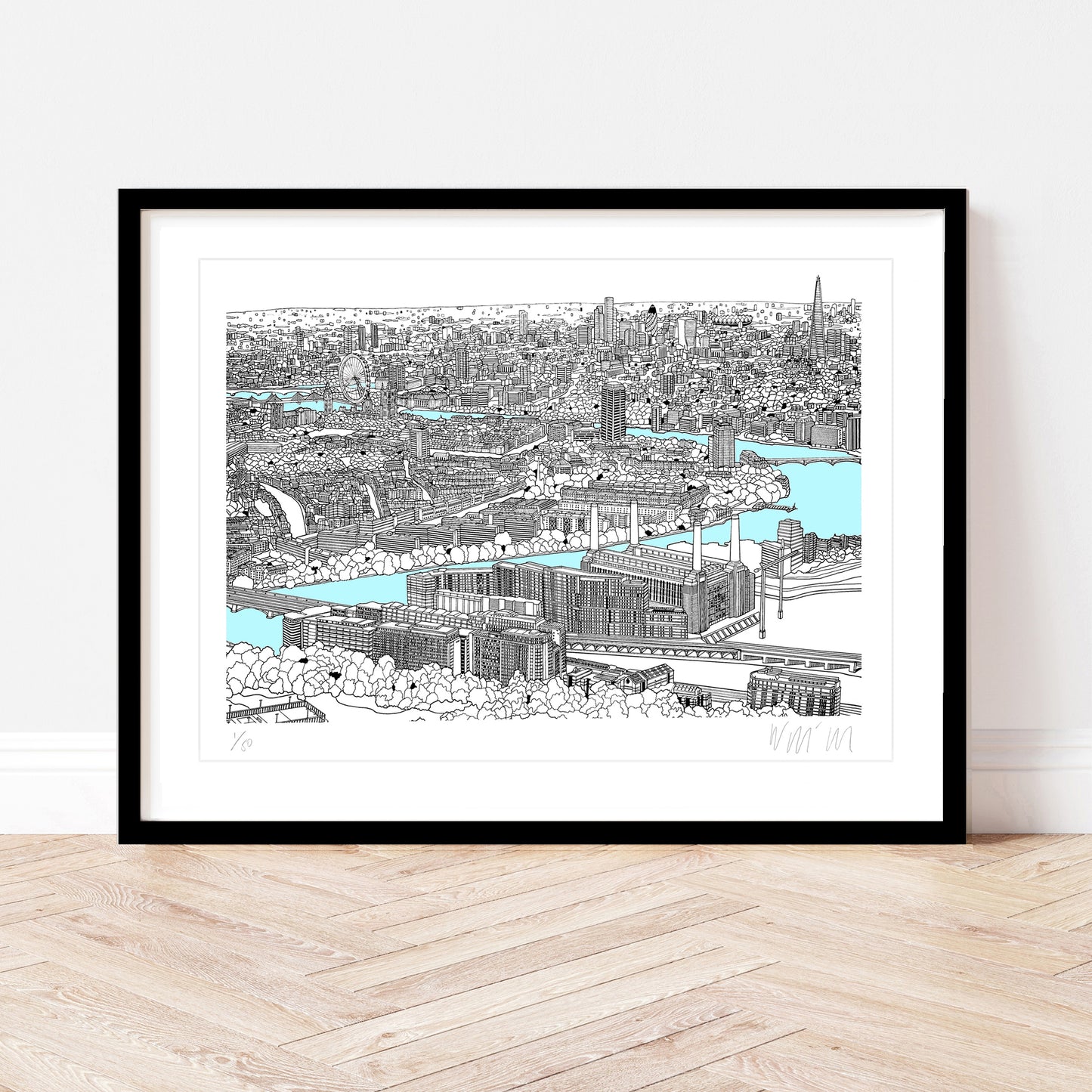 This illustration took a number of months to complete and looks from the south of the River Thames over Battersea and out across London. The print features landmarks such as Battersea Power Station, Chelsea Bridge, Westminster Abbey, the Houses of Parliament, the London Eye, the City of London and the Shard.