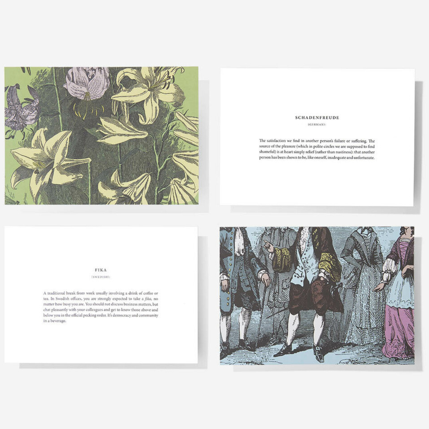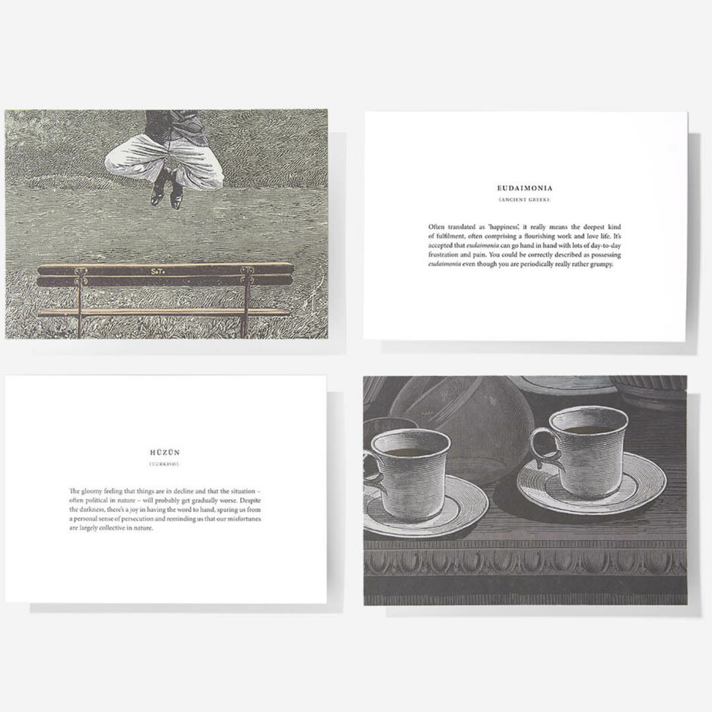 This set of cards define some of our favourite words from the world’s languages and married them up with complementary images to create cards that bring some of our most important feelings into focus. We’ve created them to prompt greater reflection about the nature of language and the emotions.
