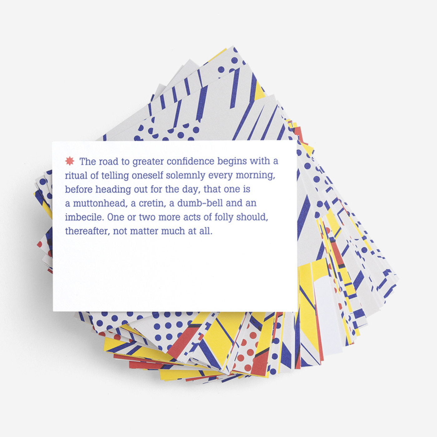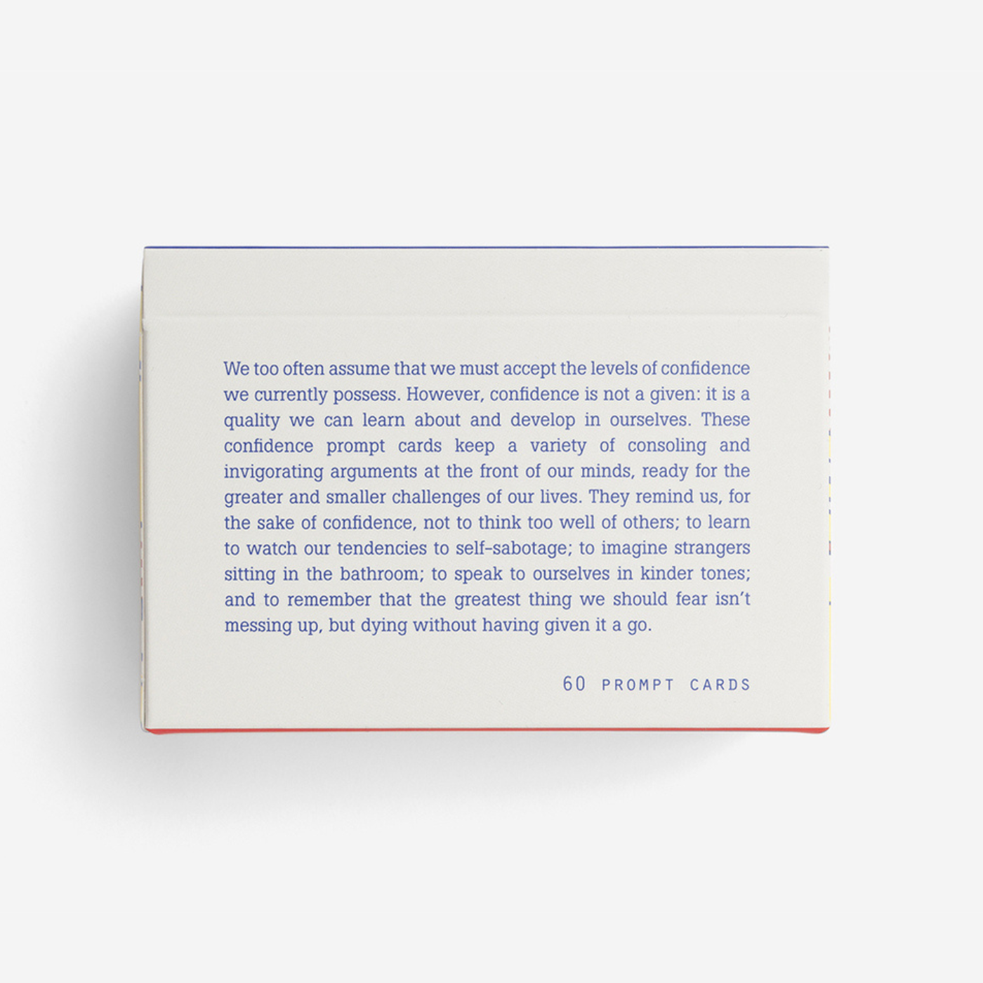 These Confidence Prompt Cards keep a variety of consoling and invigorating arguments at the front of our minds, ready for the greater and smaller challenges of our lives. They remind us, for the sake of confidence, not to think too well of others; to speak to ourselves in kinder tones; and to remember that the greatest thing we should fear isn’t messing up, but dying without having given it a go.