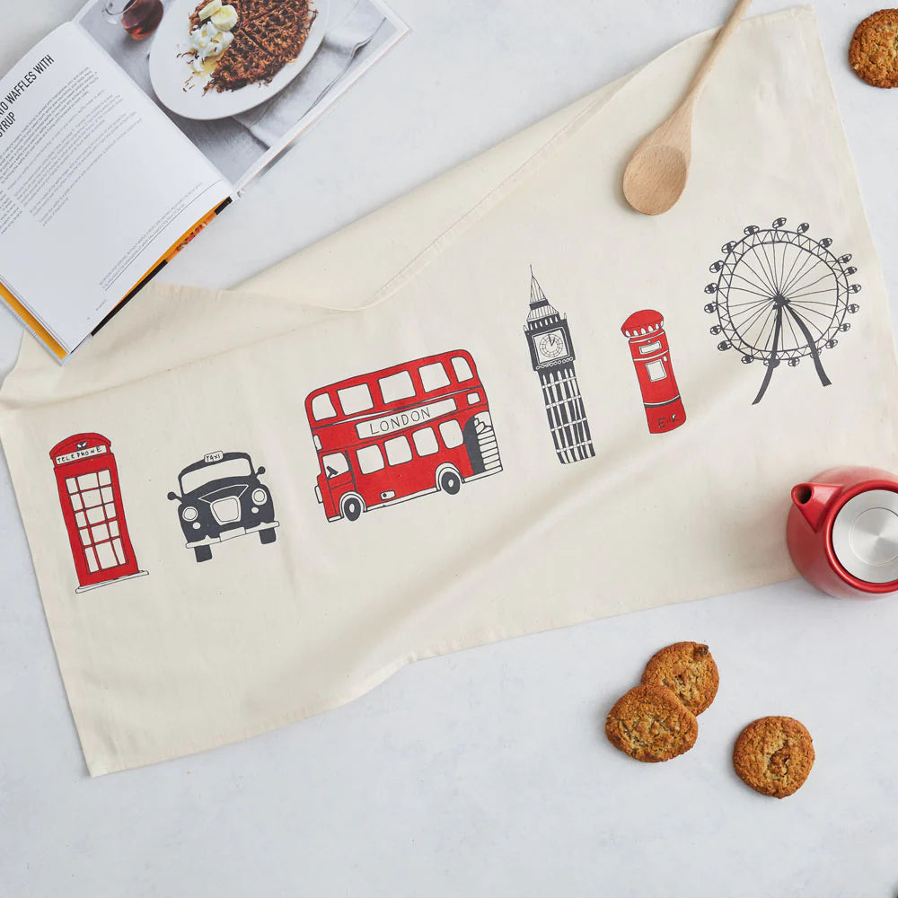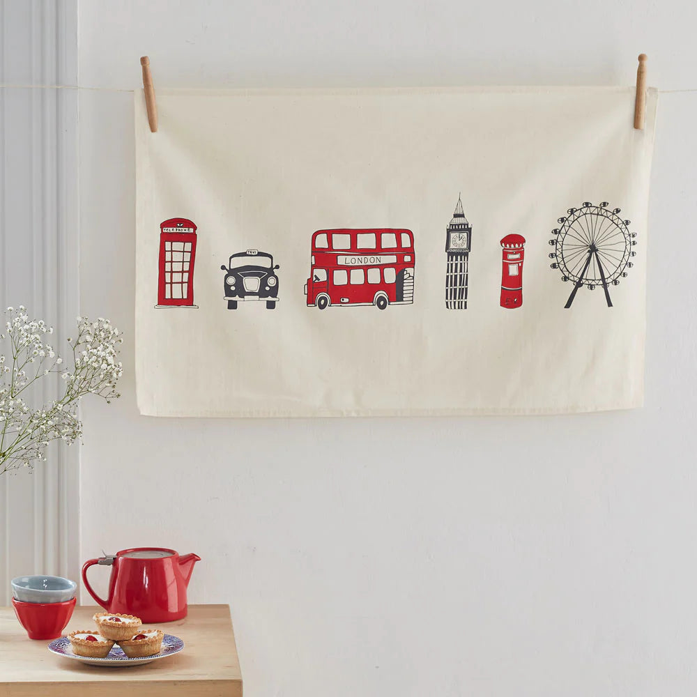 This bold London Skyline tea towel highlights 6 London icons so associated with Britishness that tourists can often been seen posing beside them, and serves as a reminder of everything you love about London.
