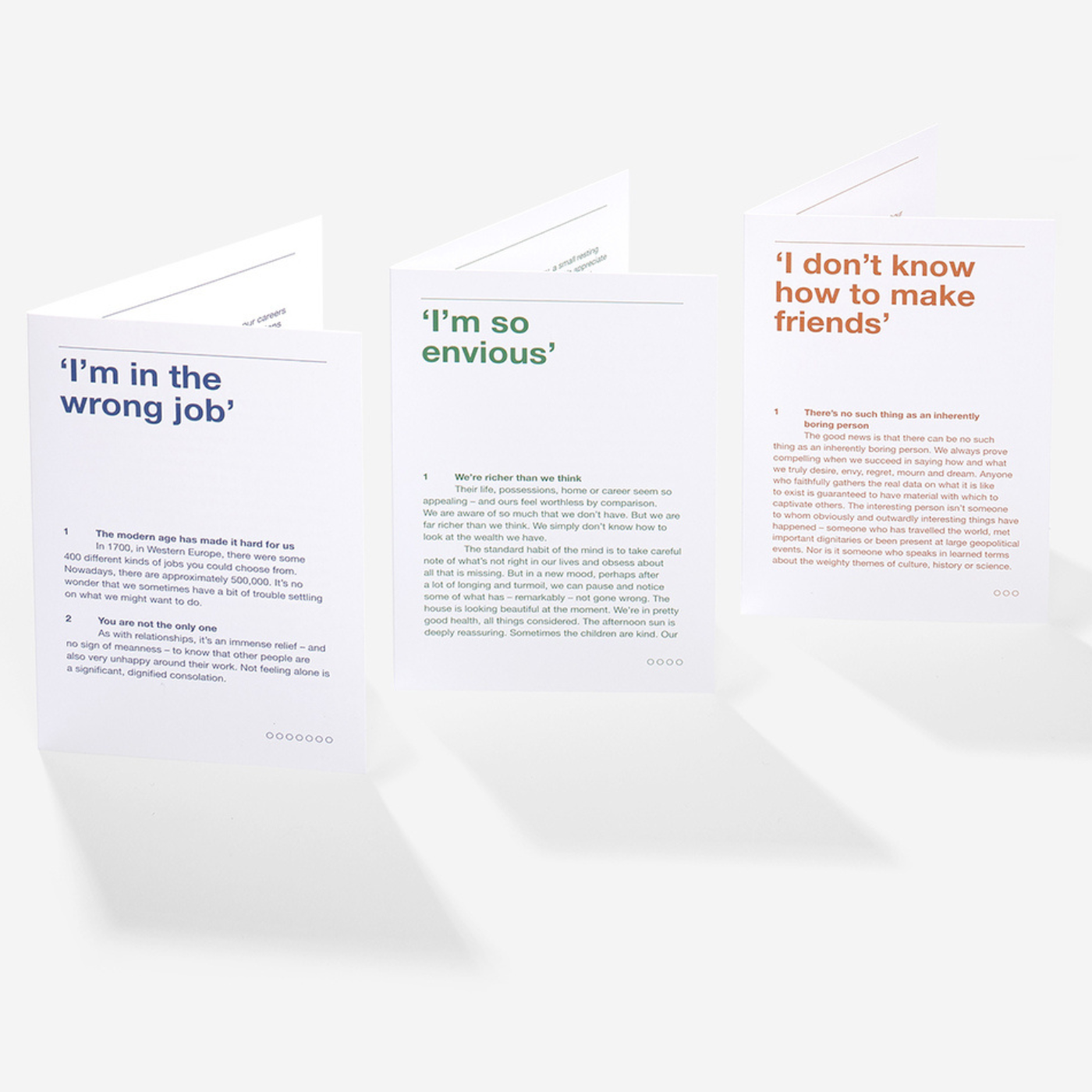 A box of wise emergency advice for 20 key psychological situations, including: Friendship, Love, Sex, Work and Self.