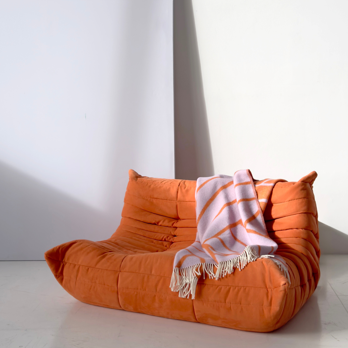 The Lines Blanket in Lilac Orange is jacquard-woven from 100% New Zealand wool with fringes on the short sides. A thick premium blanket that is mirror-inverted on the opposite side. It keeps you warm and upgrades your living room in a split second.
