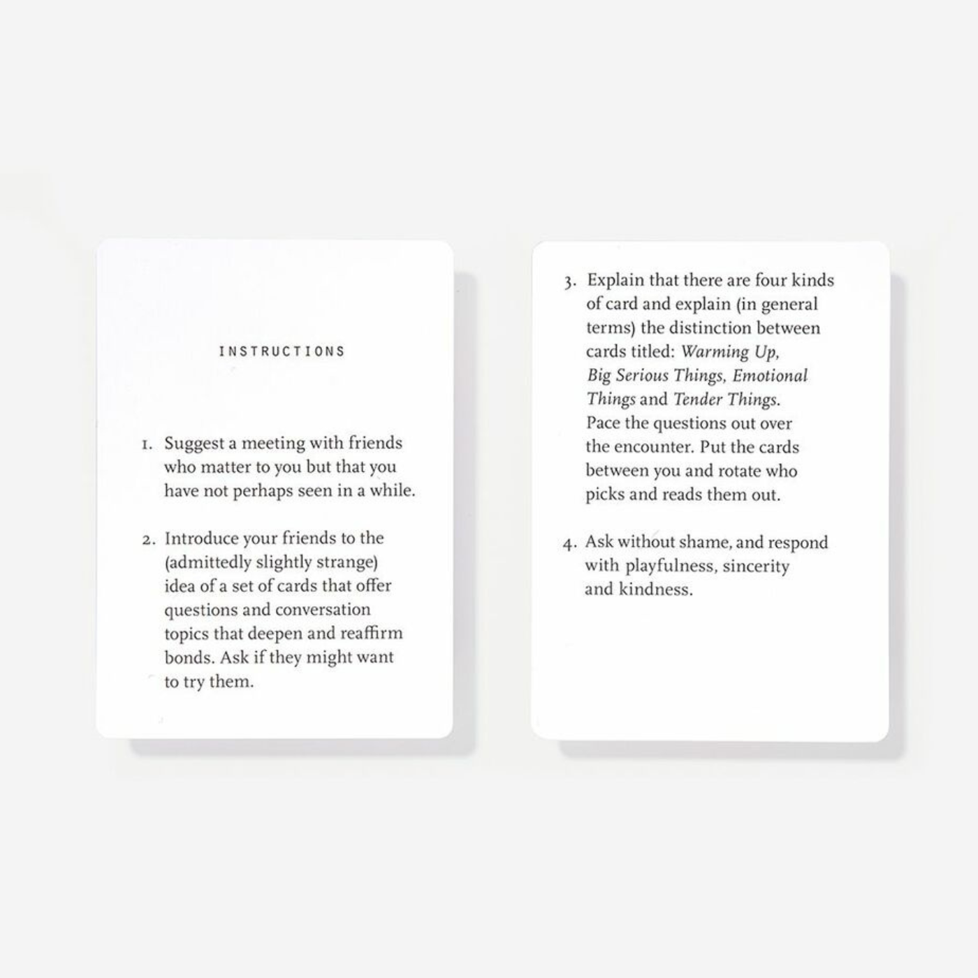 52 cards with questions and exercises for deeper and more meaningful conversations with friends.